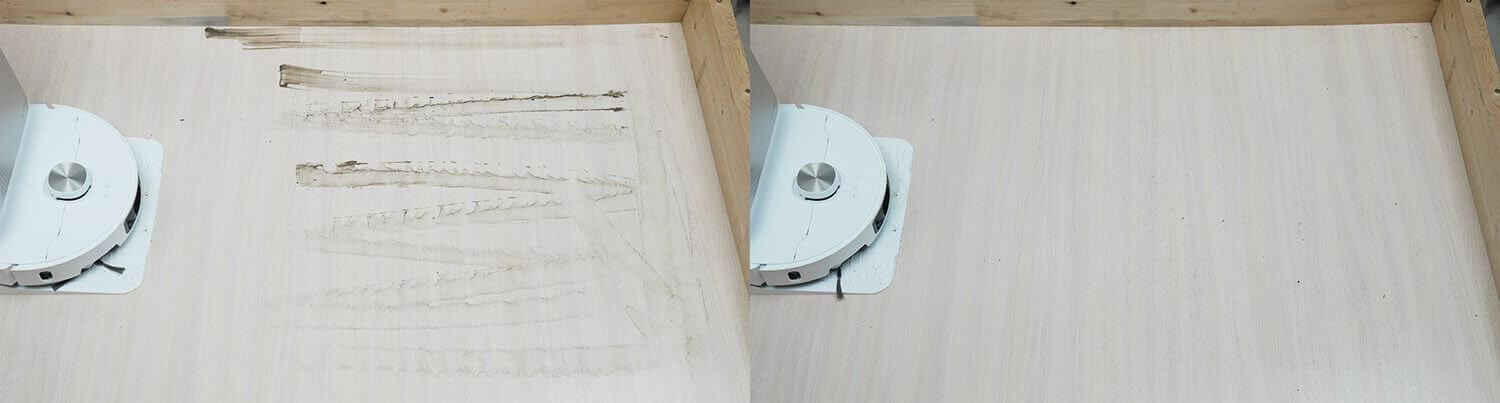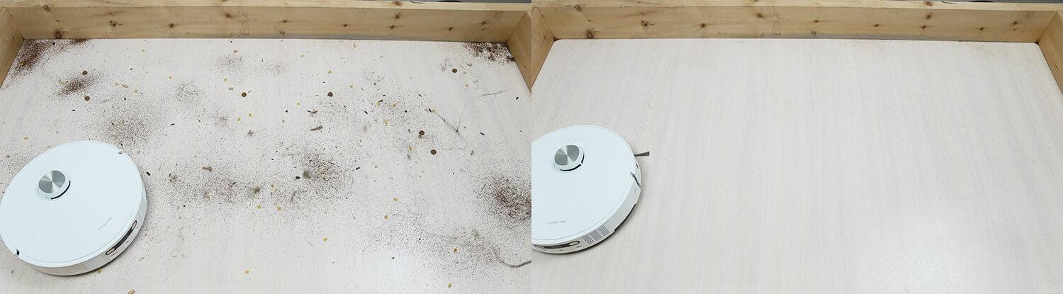 Laminuotų grindų šiukšlių surinkimo kokybė buvo gera. Nuo stovo buvo surinktos įvairios šiukšlės, įskaitant kačių kraiko granules, kurios dažnai užkemša turbo šepetį. Svarbu tai, kad šis robotas dulkių siurblys gerai išvalė kampus dėl ištraukiamo šoninio šepečio.