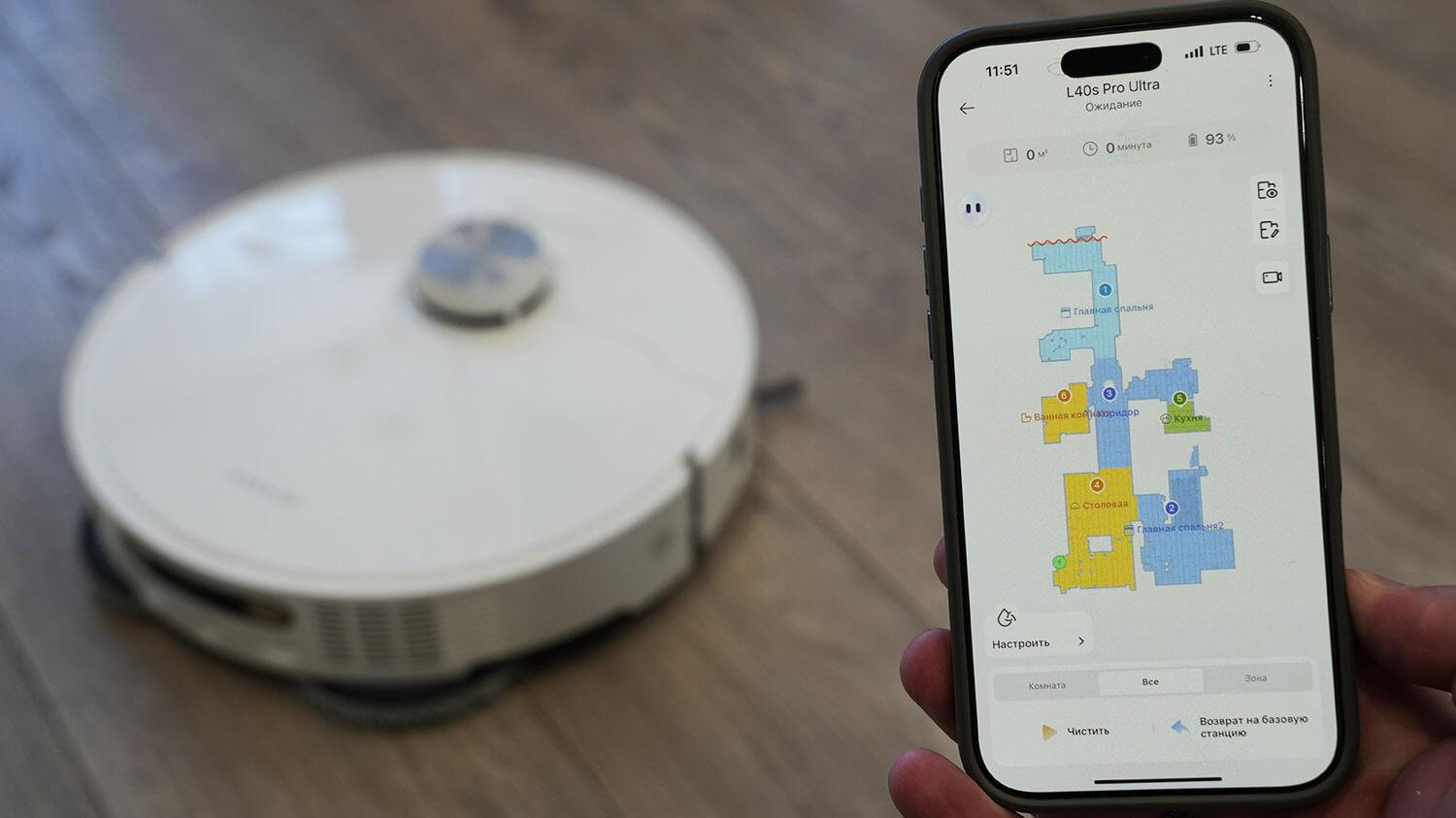 Kalbant apie funkcijas, „Dreame L40s Pro Ultra“ valdomas per patentuotą „Dreamehome“ programėlę. Jis be jokių problemų prisijungia prie tinklo, nėra jokių regioninių užraktų ar laikinų sprendimų. Programėlė yra rusų kalba, o pats robotas taip pat kalba rusiškai. Viskas patogu ir intuityvu.