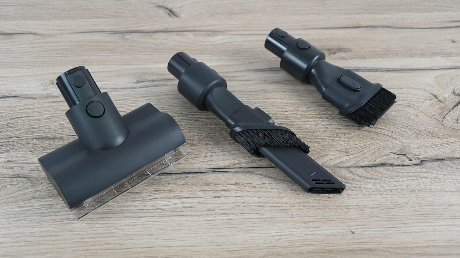 Papildomi priedai yra standartiniai. Tiesą sakant, man labiau patiko pirmosios „R10 Pro“ versijos plyšių valymo antgalis. Jis turėjo prailgintą antgalį su lanksčiu įdėklu, todėl buvo lengva pasiekti sunkiai pasiekiamas vietas.