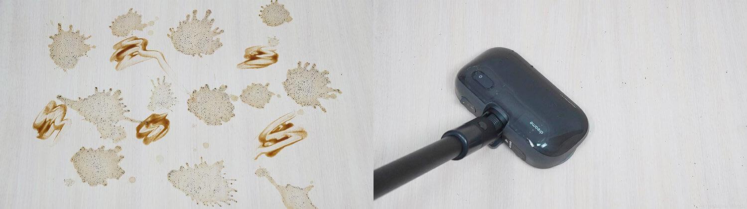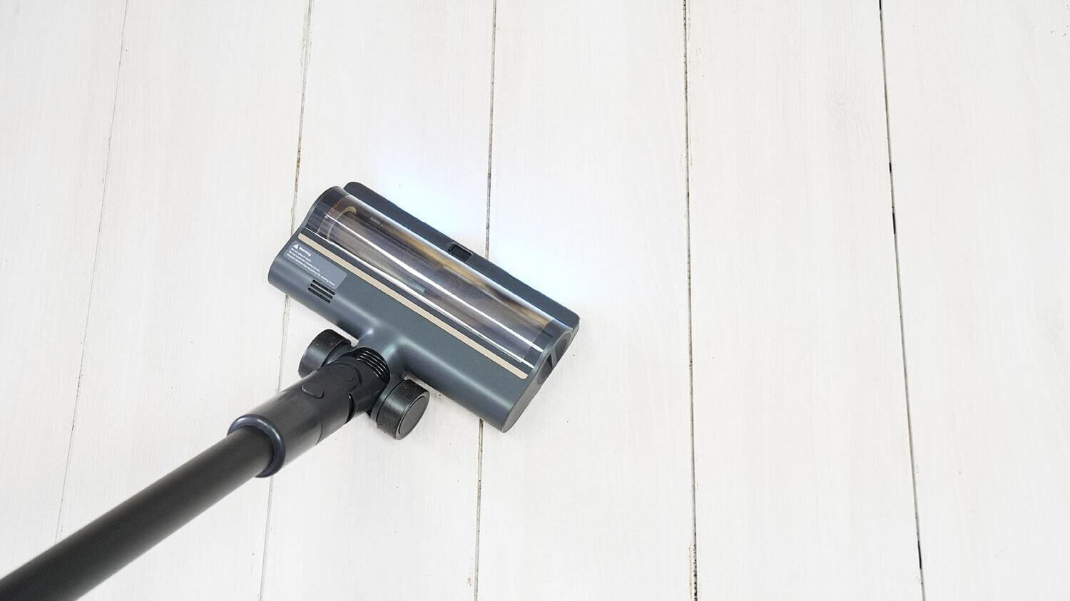 Taip pat išbandžiau grindų blizgiklio veiksmingumą. Jis pašalino net sunkiai įveikiamas dėmes, tokias kaip pridžiūvusios kavos ir padažo dėmės. Tai užtruko mažiau nei tris minutes. Palyginimui, specializuoti vertikalūs plovimo dulkių siurbliai tą pačią užduotį atlieka mažiausiai per keturias su puse minutės. Tačiau vertikalūs plovimo dulkių siurbliai šiuo atžvilgiu yra daug efektyvesni, nes jie savaime išsivalo naudojimo metu ir nepalieka dryžių. Naudojant šį grindų blizgiklio antgalį, pagalvėlės užsikemša nešvarumais ir trina jas per grindis. Valymo metu jas reikės nuimti, nuplauti ir kelis kartus pakeisti.