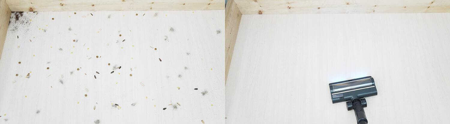 Dabar patikrinkime, kaip gerai „Dreame R10 Pro Aqua“ surenka grindų šiukšles. Ant laminuotų grindų išbarsčiau įvairių rūšių šiukšles: plaukus, kailį, grūdus ir kitas smulkias buitines šiukšles. Ši mašina atliko gerą darbą. Svarbu atkreipti dėmesį, kad ji nesurenka šiukšlių palei grindjuostes ir kampuose pirmuoju praėjimu, bet kruopščiai surenka viską.