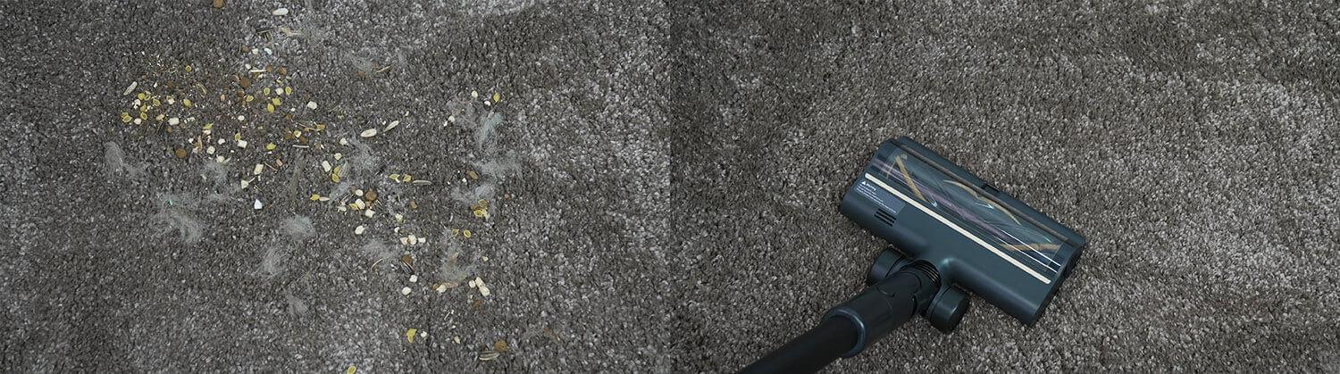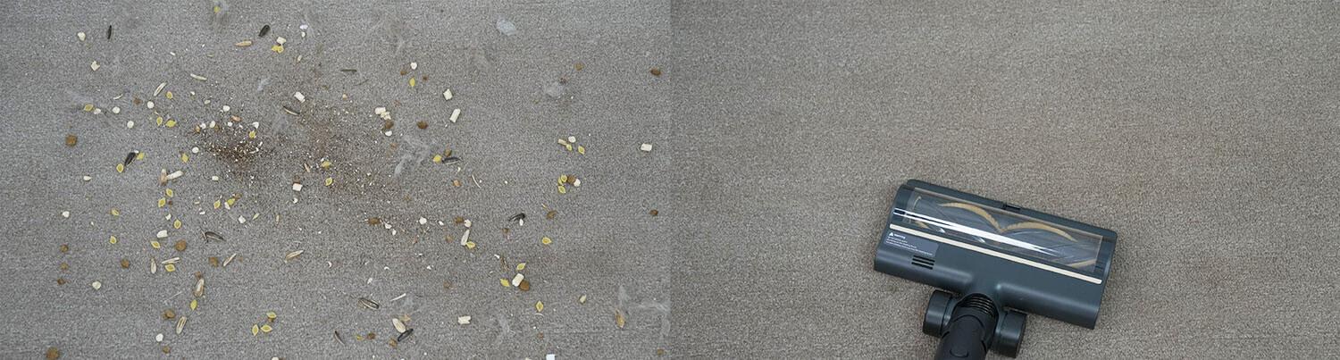 Tos pačios šiukšlės buvo išbarstytos ant kilimo, o „Dreame R10 Pro Aqua“ atliko tokį pat gerą darbą, kruopščiai išvalydamas žemo ir vidutinio plauko kilimą.