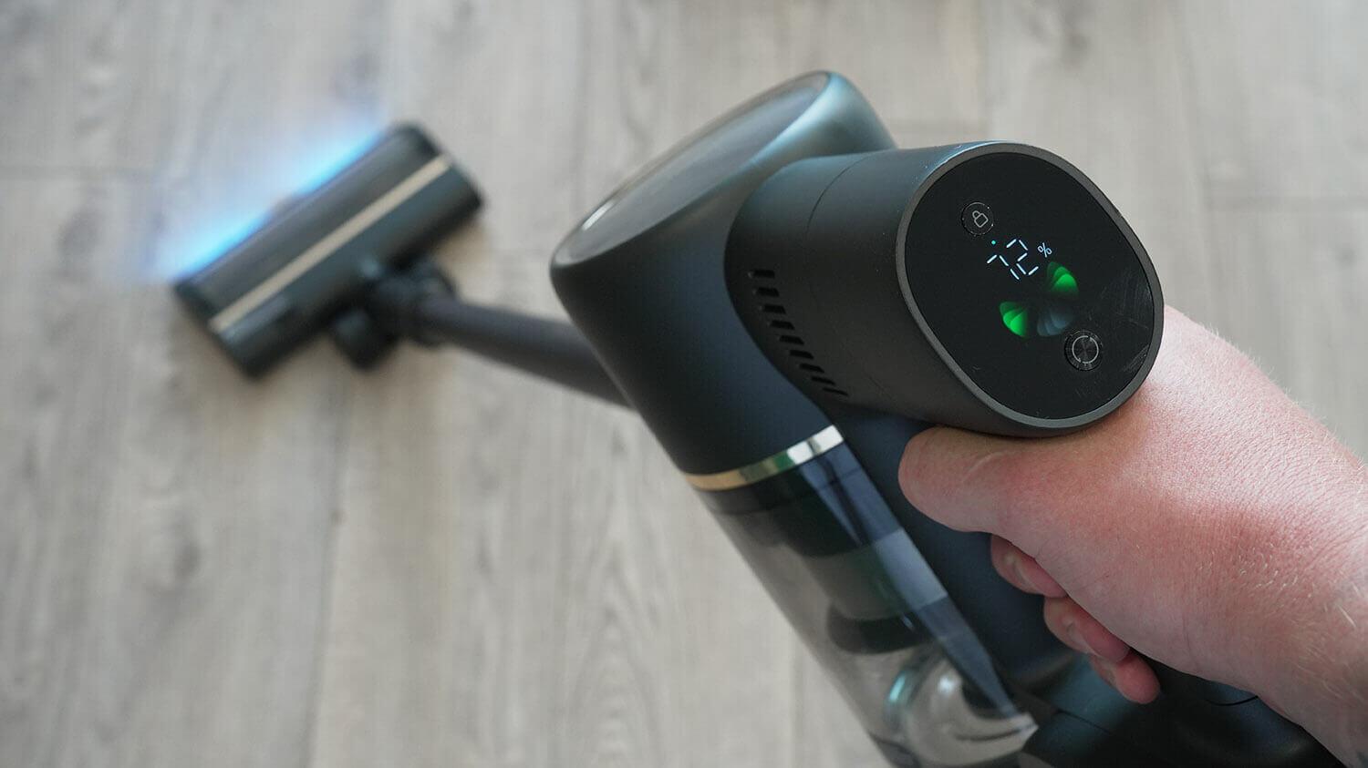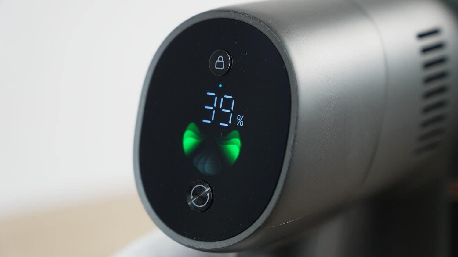 Visa informacija rodoma ekrane, kuris, beje, yra antras skirtumas nuo anksčiau išleisto „Dreame R10 Pro“, kuris turėjo mechaninio režimo perjungimo mygtuką.