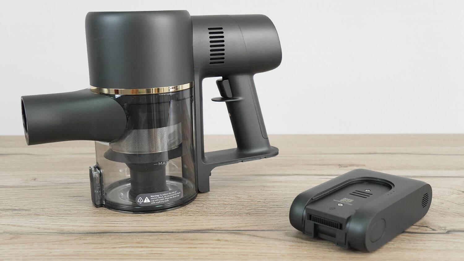Dabar pažvelkime į „Dreame R10 Pro Aqua“ dizainą. Pradėkime nuo pagrindinio įrenginio. Viduje yra 425 vatų variklis, generuojantis iki 150 oro vatų siurbimo galią. Galia elegantiškame juodame korpuse! Šis žvėris įjungiamas ir išjungiamas paspaudus mygtuką.