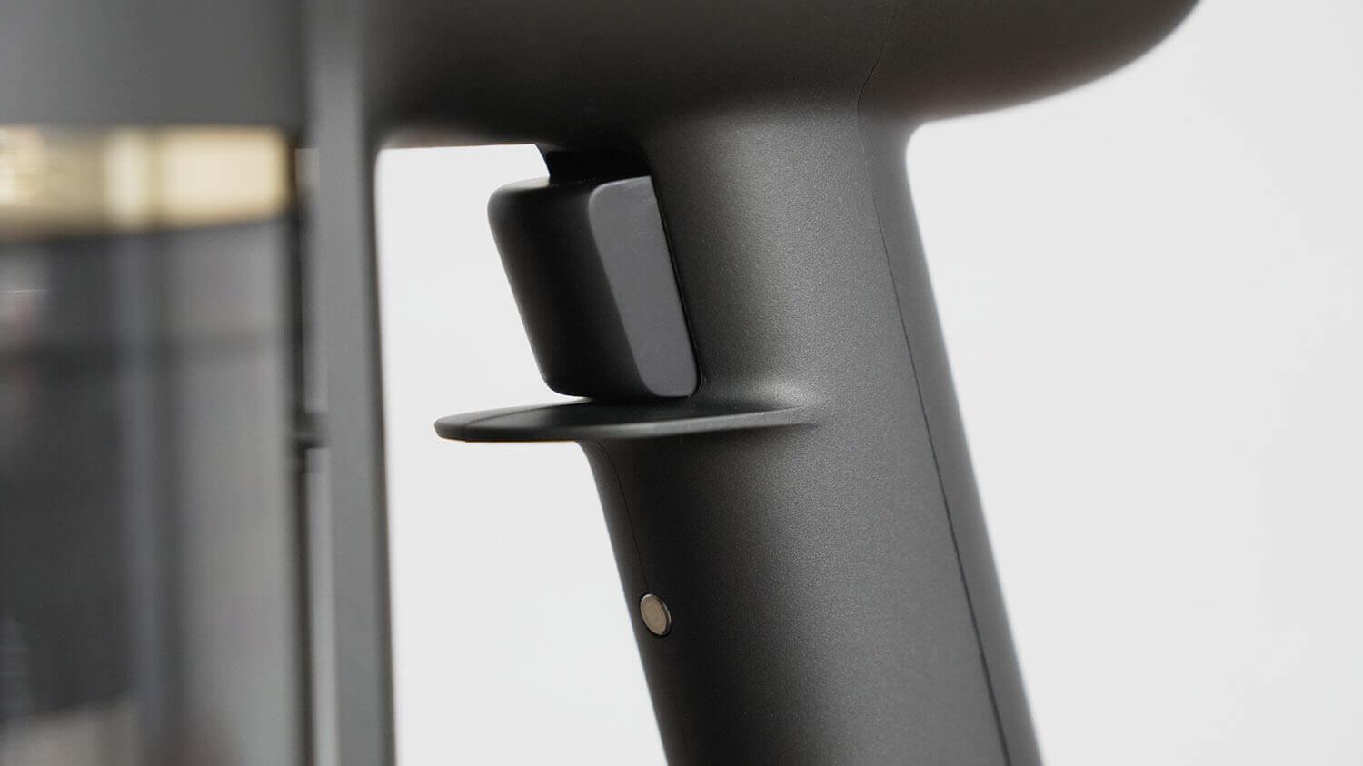 Šalia ekrano yra mygtukas, skirtas keisti veikimo režimus, kurių mūsų herojus turi tris: vidutinis (numatytasis), žemas ir turbo režimas. Ir tai dar ne viskas! Viršuje matysite mygtuką, skirtą užrakinti dulkių siurblį, kai jis įjungtas, kad nereikėtų laikyti gaiduko pirštu. Tikras išsigelbėjimas jūsų pirštams, sakau jums!