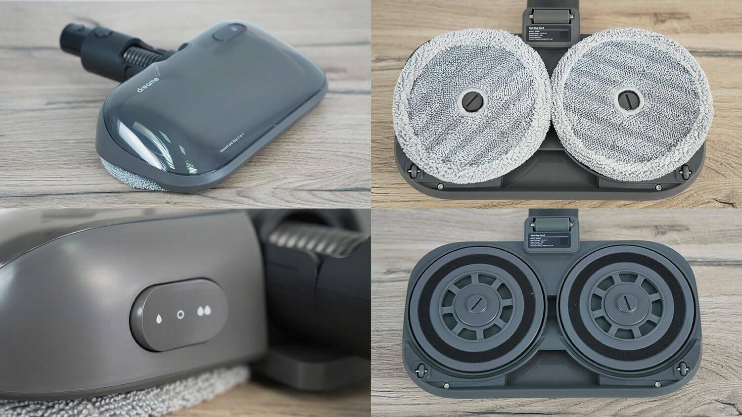 Aš jau esu susipažinęs su poliravimo antgaliu. Jis turi panašų. Dreame V16, kuris gaminamas Kinijos rinkai. Valymo modulį sudaro dvi apvalios besisukančios pagalvėlės. Tarp jų yra siurbimo anga, leidžianti dulkių siurbliui susiurbti lengvas šiukšles valant grindis. Tačiau reikia pripažinti, kad siurbimo galia yra minimali ir tinka tik trupiniams, plaukams ir dulkėms. Vanduo į pagalvėles tiekiamas per specialius dozatorius. Antgalio rezervuare telpa iki 200 ml vandens. Galimi du vandens srauto greičiai, leidžiantys pasirinkti optimalų skirtingiems paviršių tipams. Beje, pagalvėlės sukasi 116 aps./min. greičiu, kurio turėtų pakakti dėmėms pašalinti.