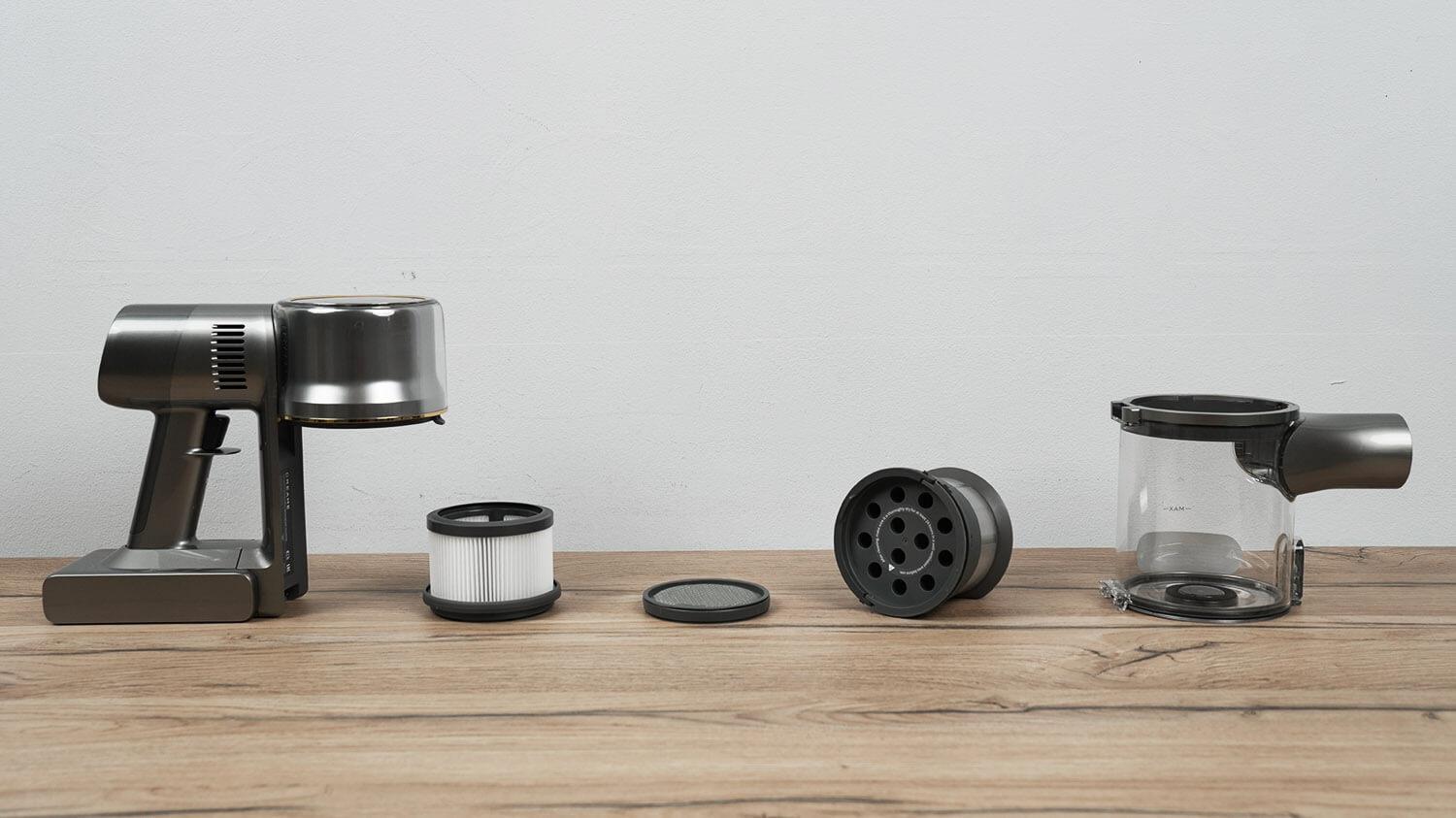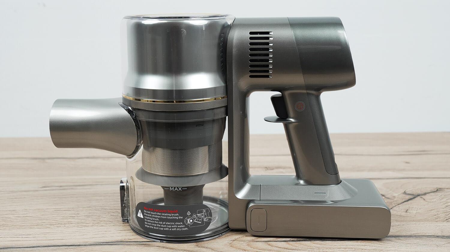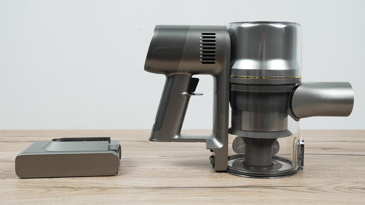 Rankena turi prievadą rankiniu būdu prijungti įkroviklį. Iš karto turėčiau atkreipti dėmesį, kad grindų stove nėra belaidžio įkrovimo laikiklio, kas yra gaila, atsižvelgiant į dulkių siurblio kainą. Dulkių konteinerio dugnas atsidaro paspaudus mygtuką. Pati dulkių konteineris yra nuimamas, o tai patogu. Filtravimo sistema yra gera: HEPA filtras, audinio filtras, cikloninis filtras ir tinklelio filtras.