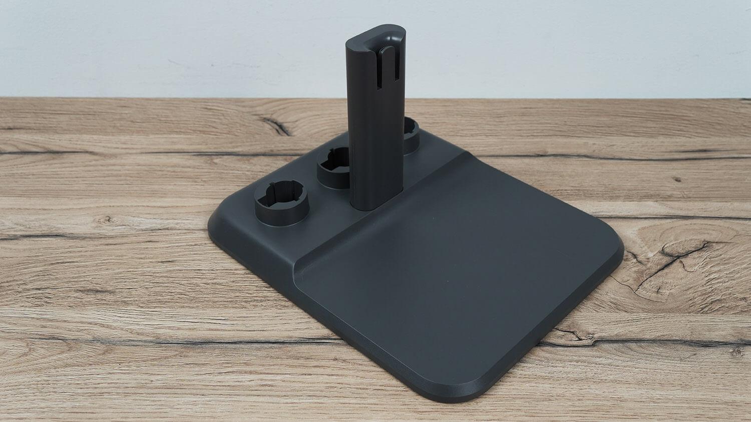 Pažvelkime atidžiau į grindų laikiklį. Jame laikomas surinktas vertikalus dulkių siurblys ir trys pridedami priedai.