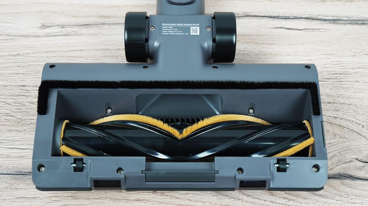 Taip pat matome jungiklį, kuris pakelia užuolaidą priešais volelį, kad surinktų didesnes šiukšles. Volelis nuimamas iš šono ir turi trumpus, elastingus šerelius, kurie efektyviai valo kilimus. Už volelio matome šukas susivėlusiems plaukams ir kailiui iššukuoti.