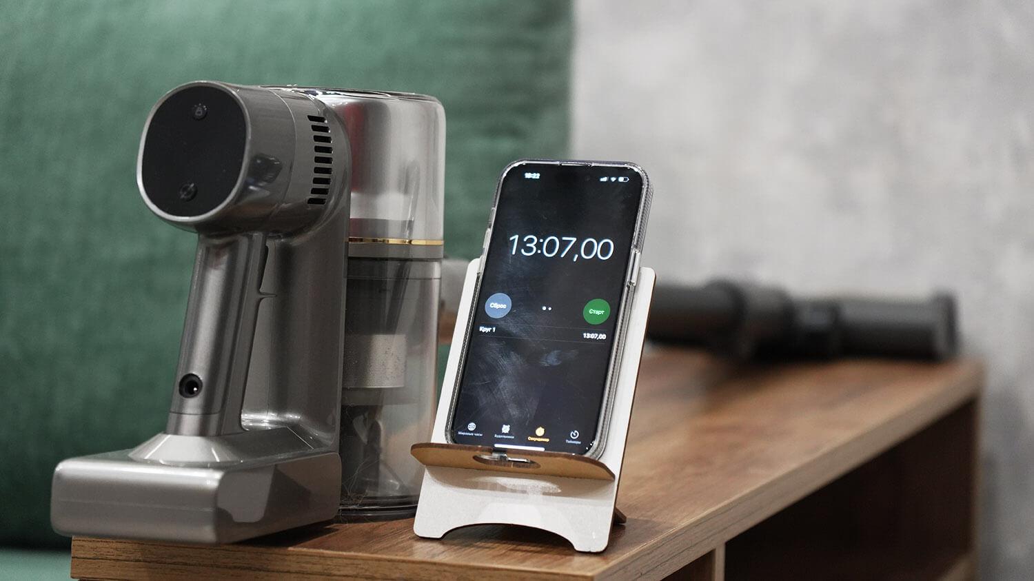 Galiausiai pereikime prie testų. Pirmiausia patikrinsime „Dreame R20 Aqua“ baterijos veikimo laiką turbo režimu su prijungtu pagrindiniu kilimų valymo voleliu. Jis veikė 13 minučių ir 7 sekundes, o tai yra tiek pat, kiek ir jo pirmtakas bei dauguma panašių įrenginių.
