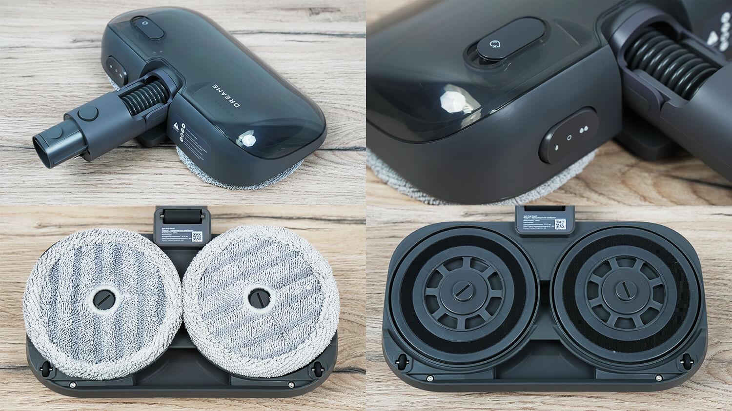 Na, poliravimo antgalis yra toks pat, kaip ir išleistas anksčiau. Dreame R10 Pro AquaSukamoji jungtis yra įtraukta. Antgalio rezervuare telpa iki 200 ml vandens. Du vandens srauto lygiai leidžia pasirinkti optimalų lygį skirtingiems grindų tipams. Vanduo į valymo pagalvėles tiekiamas per specialius dozatorius. Pagalvės sukasi priešingomis kryptimis, efektyviai pašalindamos nešvarumus ir dėmes nuo grindų. Tarp pagalvėlių yra siurbimo anga, skirta surinkti lengvas šiukšles šluostant grindis. Siurbimas minimalus.
