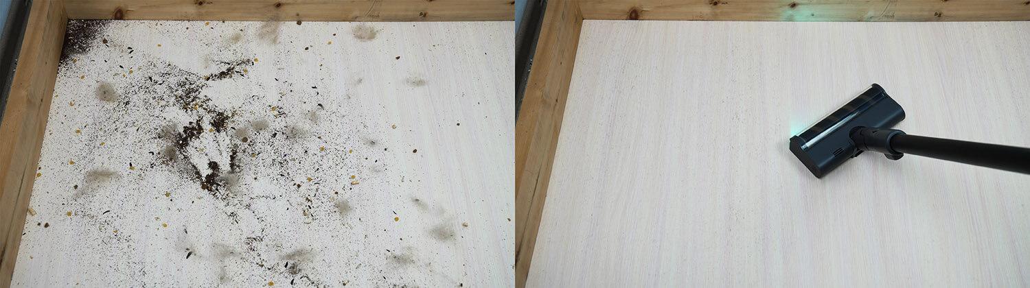 Dabar patikrinkime, kaip gerai „Dreame R20 Aqua“ surenka grindų šiukšles. Ant laminuotų grindų išbarsčiau įvairių rūšių šiukšles: plaukus, kailį, grūdus ir kitas smulkias buitines šiukšles. Ši mašina atliko gerą darbą.