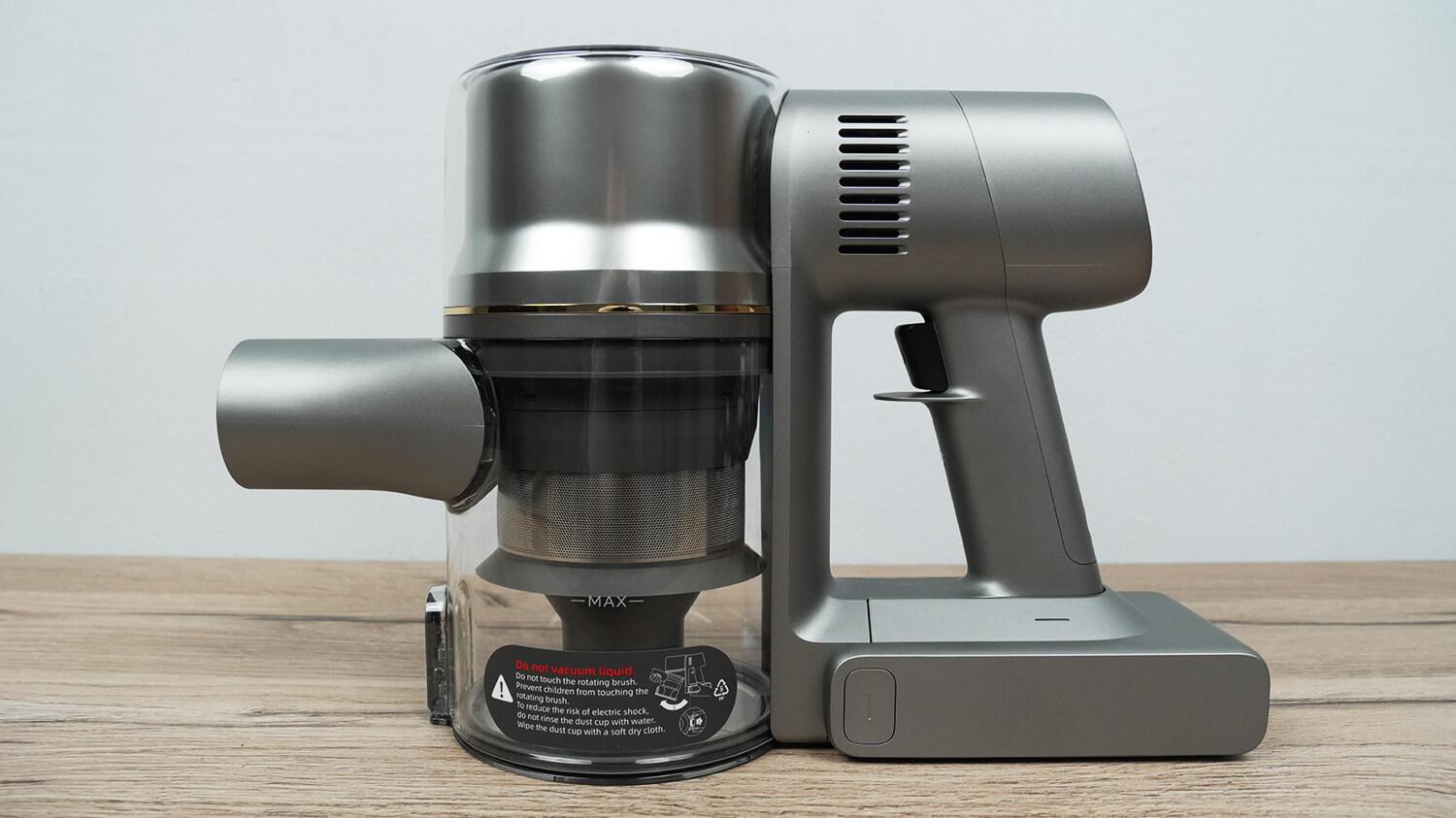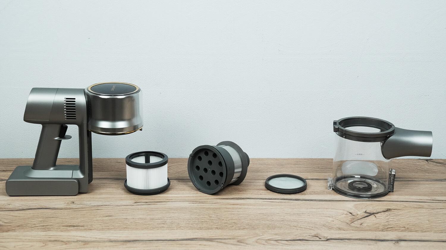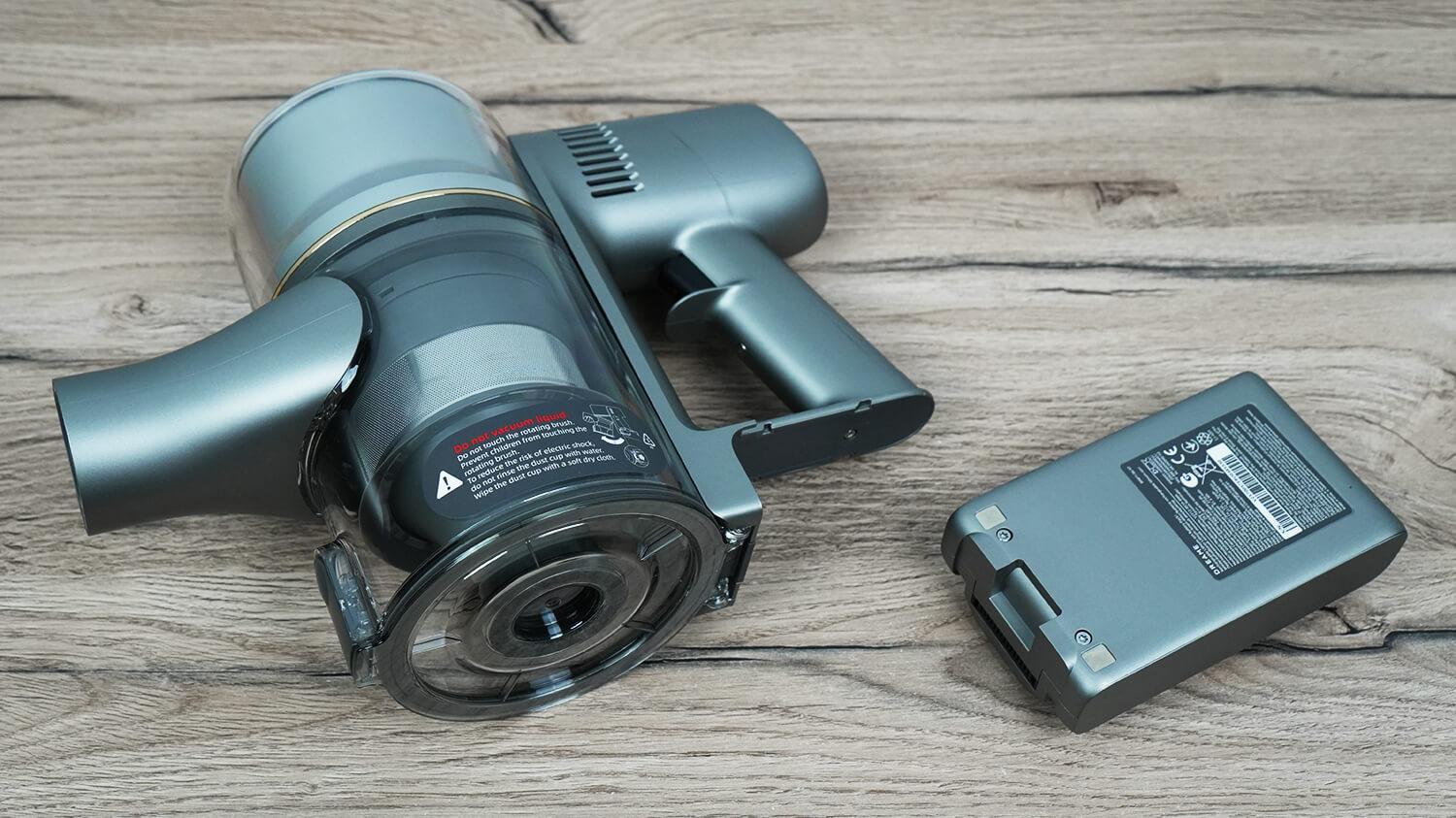 Dulkių talpykla ištuštėja paspaudus apačioje esantį atleidimo mygtuką. Ją taip pat galima visiškai išimti iš korpuso, kad būtų patogu prižiūrėti. Filtravimo sistemą sudaro HEPA filtras, audinio filtras, multicikloninė sistema, sudaryta iš 12 ciklonų, ir tinklelio filtras. Susidomėjusiems, dulkių talpyklos talpa yra 600 ml.