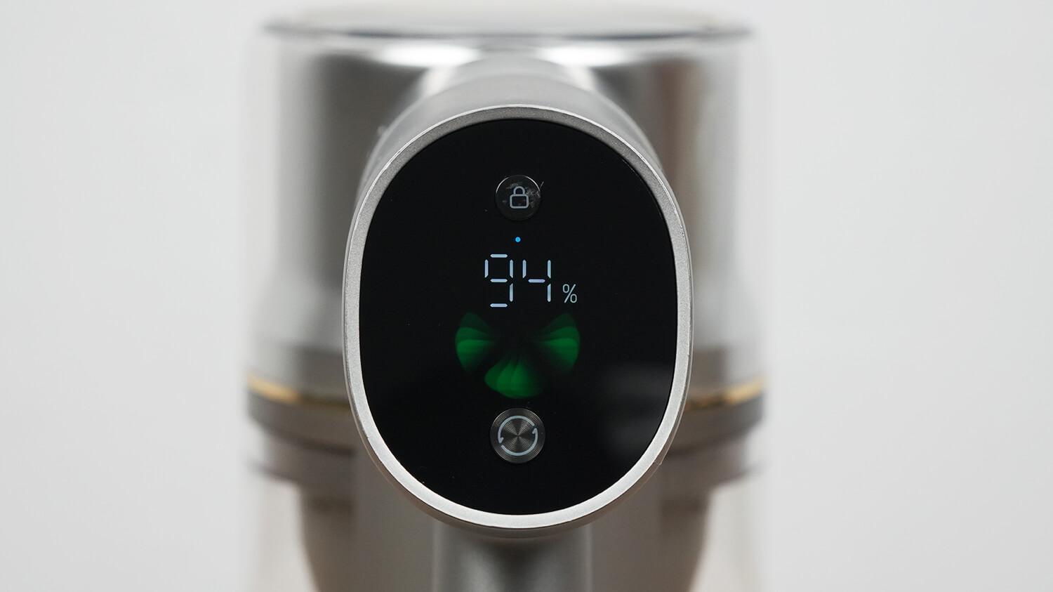 Ekrane rodomas akumuliatoriaus įkrovos procentas, pasirinktas veikimo režimas ir techninės priežiūros pranešimai. Yra tik du veikimo režimai: automatinis ir turbo. Automatiniu režimu „Dreame R20 Essential“ automatiškai reguliuoja siurbimo galią, atsižvelgdamas į grindų nešvarumo lygį.