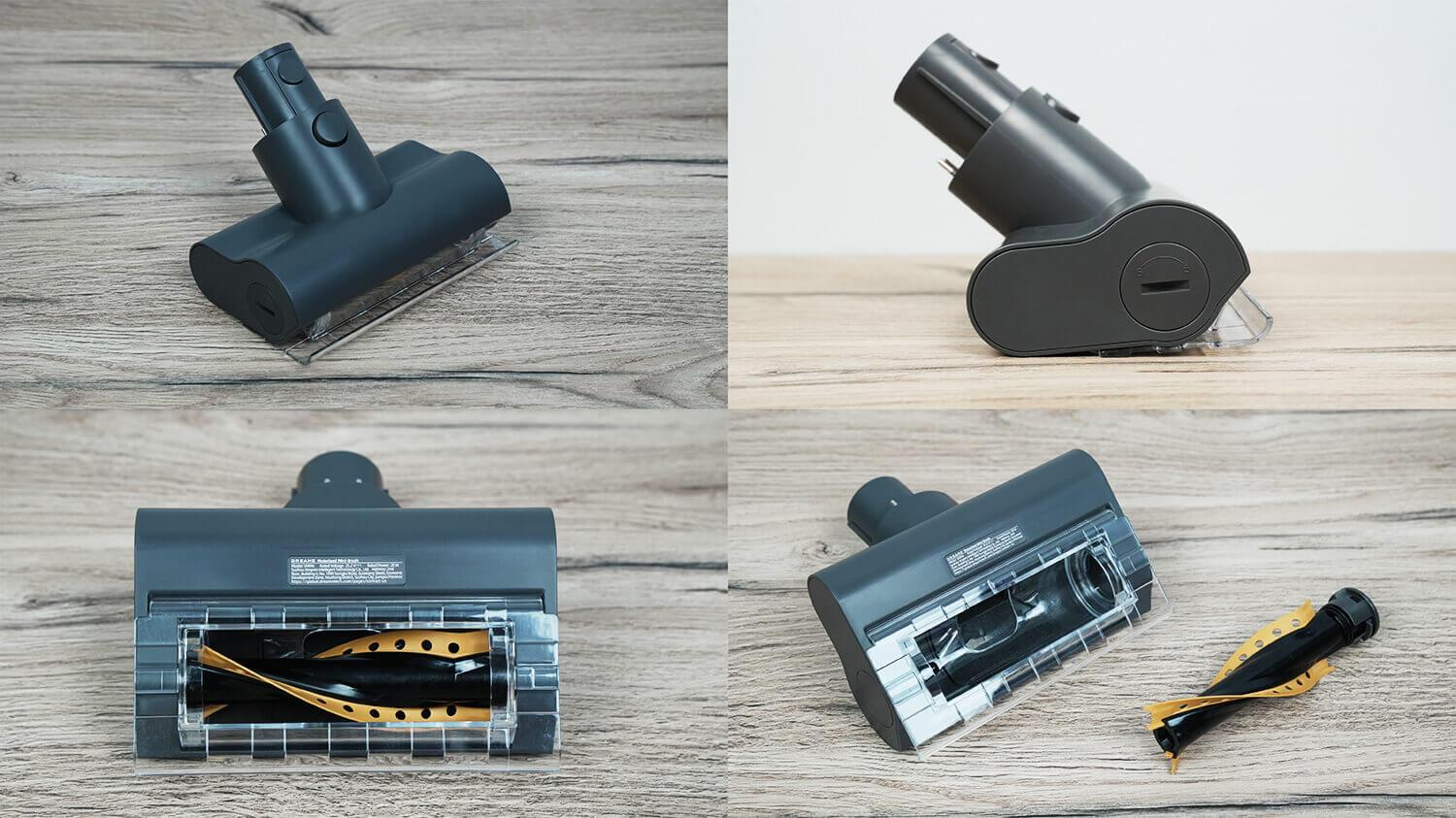 Pažvelkime į pridedamus priedus. Pagrindinis grindų antgalis yra identiškas tam, kuris pridedamas prie flagmaninio vertikalaus dulkių siurblio. Dreame Z40 stotisŠis priedas turi pasukamą jungtį, priekinės užuolaidos pakėlimo jungiklį didelėms šiukšlėms surinkti ir žibintą.
