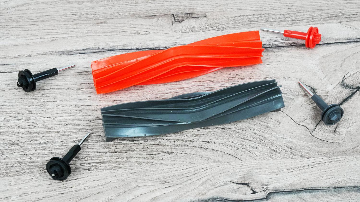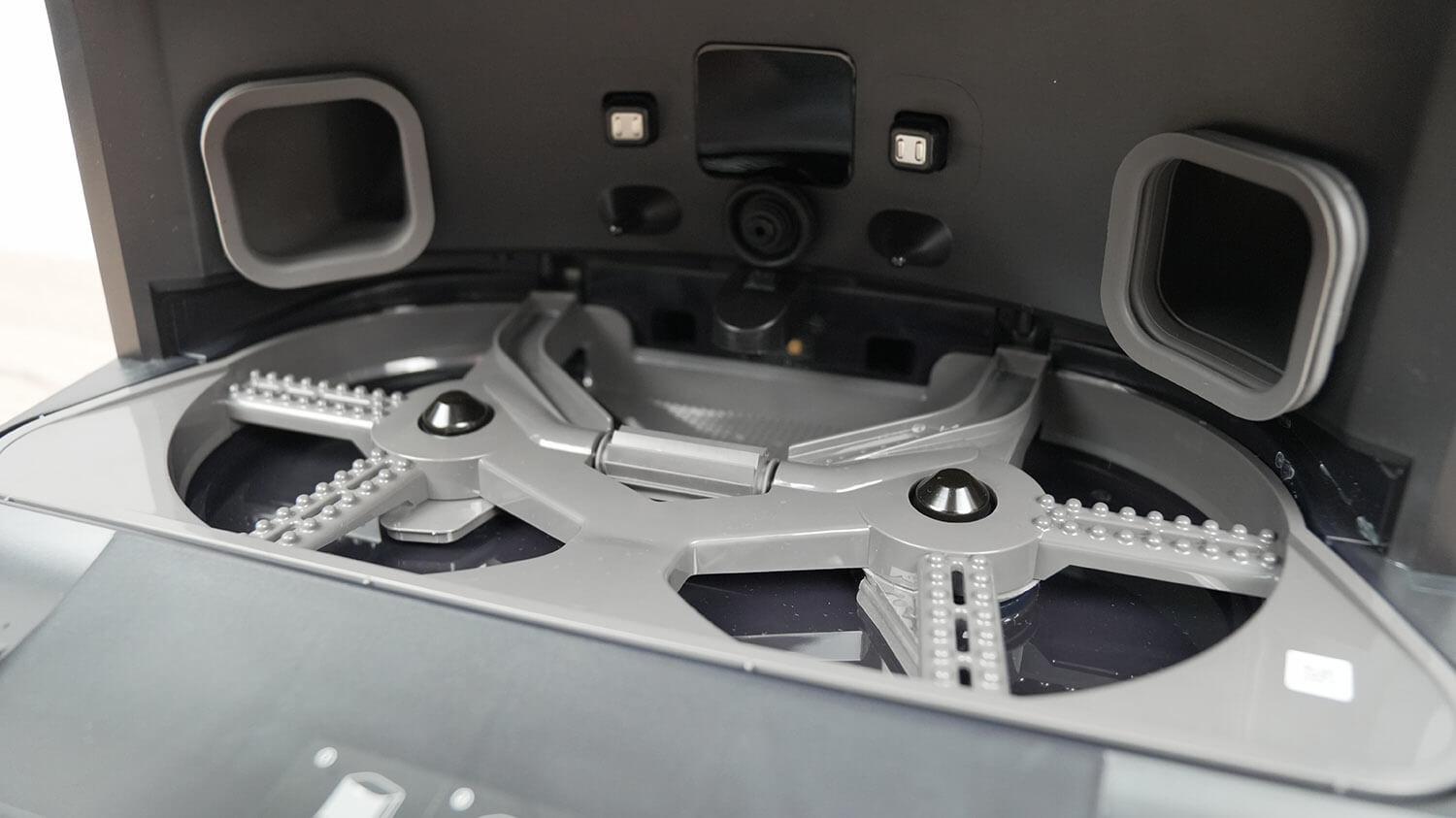 Pagrindiniame valymo modulyje dabar yra du silikoniniai voleliai, įkvėpti „iRobots“ ir „Roborock S8“ serijos. Šepečių blokas yra judrus, o tai yra privalumas. Šepečius iš abiejų pusių galima nuimti, kad būtų pašalinti susivėlę plaukai ir naminių gyvūnėlių plaukai. Šepečių blokas taip pat pakyla valant grindis ir grįžtant į stotį.