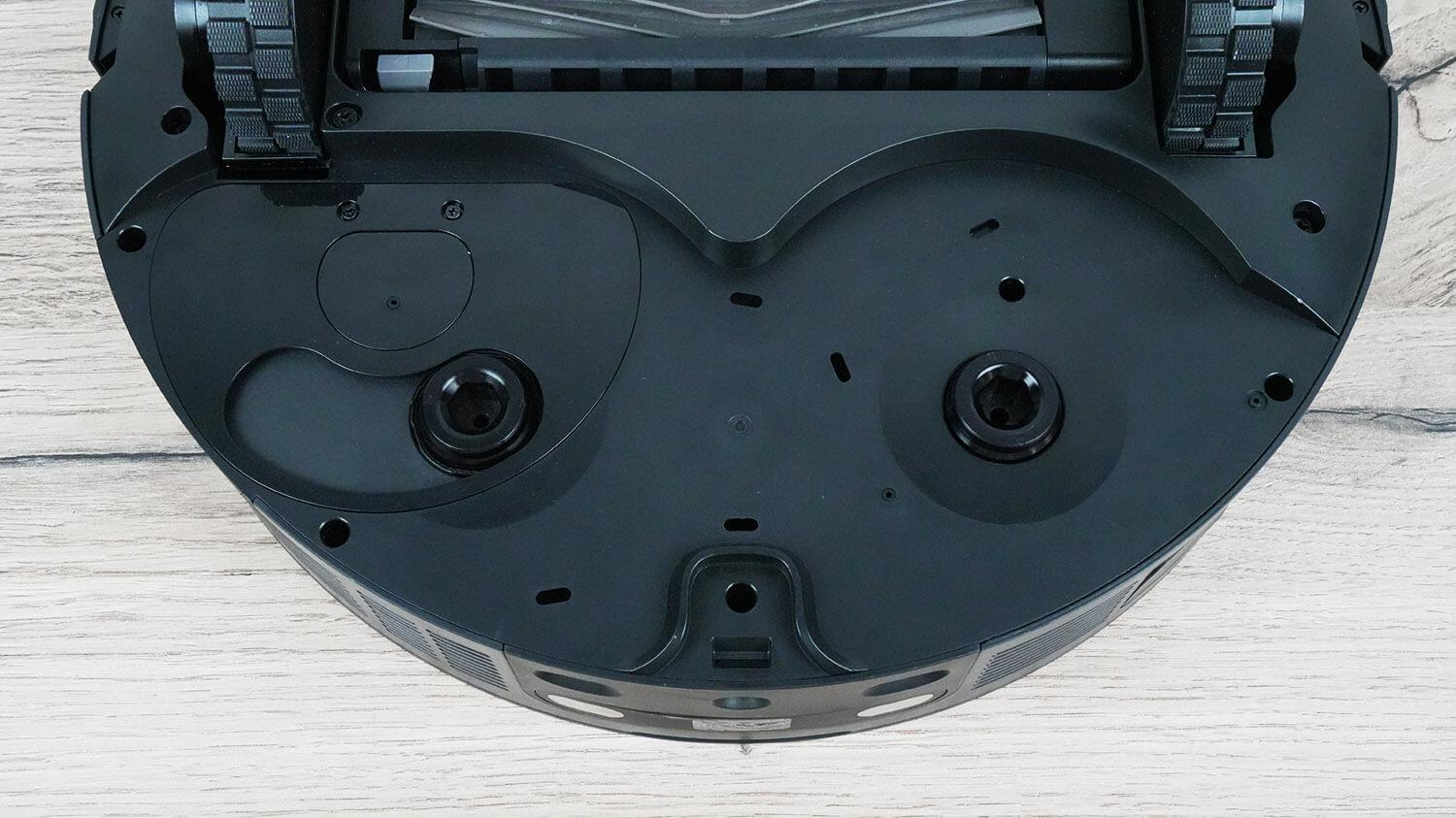 Už turbo šepečio yra du valymo šluosčių laikikliai. Tai įprasta „Dreame“ robotinių dulkių siurblių konstrukcija. Už kairiosios valymo šluostės matome mechanizmą, kuris išplečia valymo šluostę iki korpuso krašto, leisdamas jai valyti grindis iki pat grindjuosčių ir baldų. Ši technologija vadinama „MopExtend“.