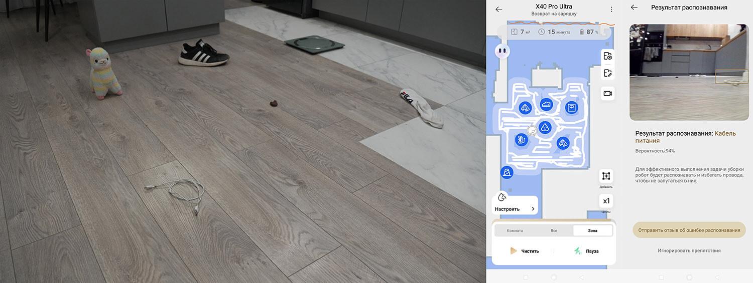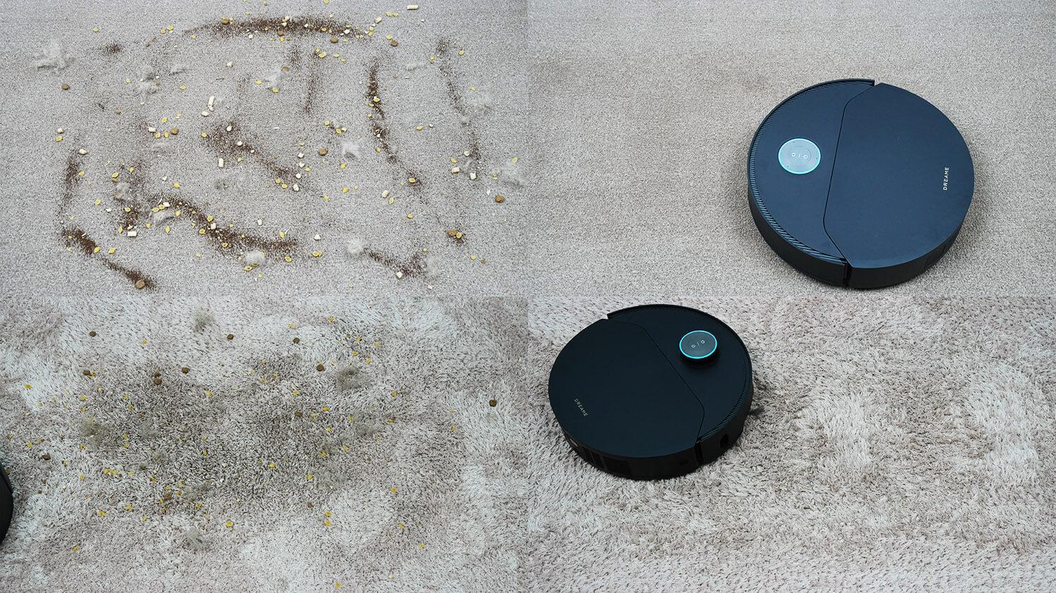 Kalbant apie kilimų valymą, „Dreame X40 Pro Ultra“ gali kruopščiai išvalyti tiek trumpo, tiek vidutinio plauko kilimus. Tačiau yra vienas svarbus trūkumas. Aptikdamas kilimus, robotas dulkių siurblys pakelia ne tik valymo pagalvėles, bet ir šoninį šepetį. Tai labai nesėkmingas konstrukcijos sprendimas. Pastebėsite, kad jei kilimas yra arti grindjuostės, lieka nedidelis kiekis šiukšlių, nes nei šoninis, nei centrinis šepetys jų nesurinko.
