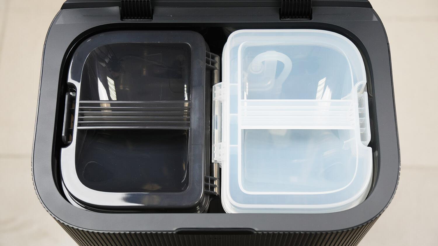 Po viršutiniu dangčiu yra nešvaraus ir švaraus vandens bakai. Švaraus vandens bake yra dezinfekavimo modulis. Tai yra privalumas. Nešvaraus vandens baką taip pat galima komplektuoti su pridedamu dezinfekavimo moduliu.