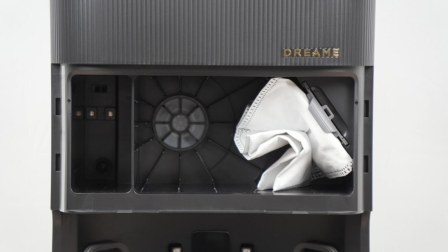 Dulkių maišelis yra centre už dangtelio, taip pat išklotas aktyvuota anglimi, kad apsaugotų nuo bakterijų. Mano nuostabai, „Dreame X40 Pro Ultra“ neturi ploviklio rezervuaro. Jį reikia įsigyti atskirai, o tai labai keistas sprendimas, turint omenyje prekės ženklo flagmaninius robotų modelius. Laimei, turėjau po ranka „X40 Ultra“ modulį, todėl bandymams panaudojau jį.