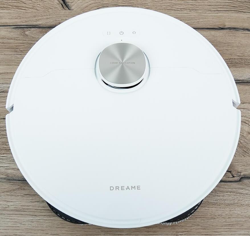 Dabar leiskite paaiškinti, kaip veikia „Dreame X40 Ultra Complete“. Jis tiekiamas tik baltos ir auksinės spalvų. Pirmiausia pažvelkime į patį robotą. Jo korpusas yra apvalus ir yra 97 mm aukštyje virš grindų.