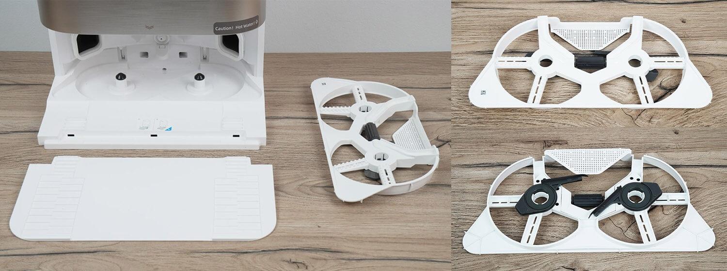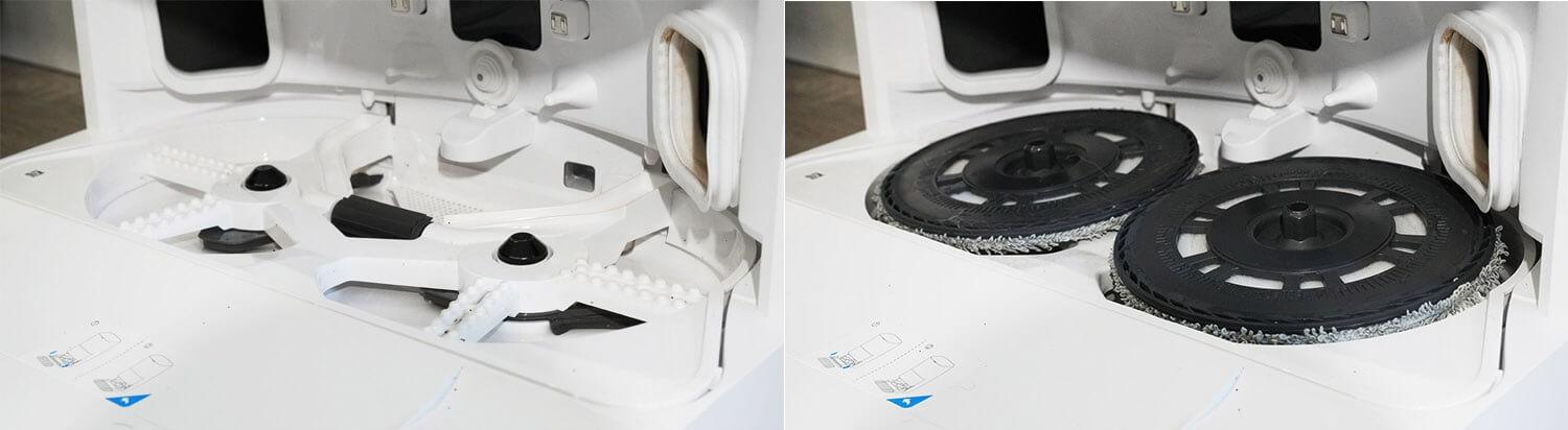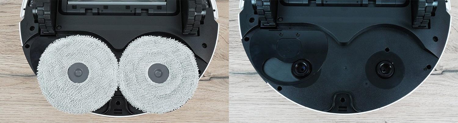 Už turbo šepečio yra du valymo šluosčių laikikliai. Tai įprasta „Dreame“ robotinių dulkių siurblių konstrukcija. Už kairiosios valymo šluostės matome mechanizmą, kuris išplečia valymo šluostę iki korpuso krašto, leisdamas jai valyti grindis iki pat grindjuosčių ir baldų. Ši technologija vadinama „MopExtend“.