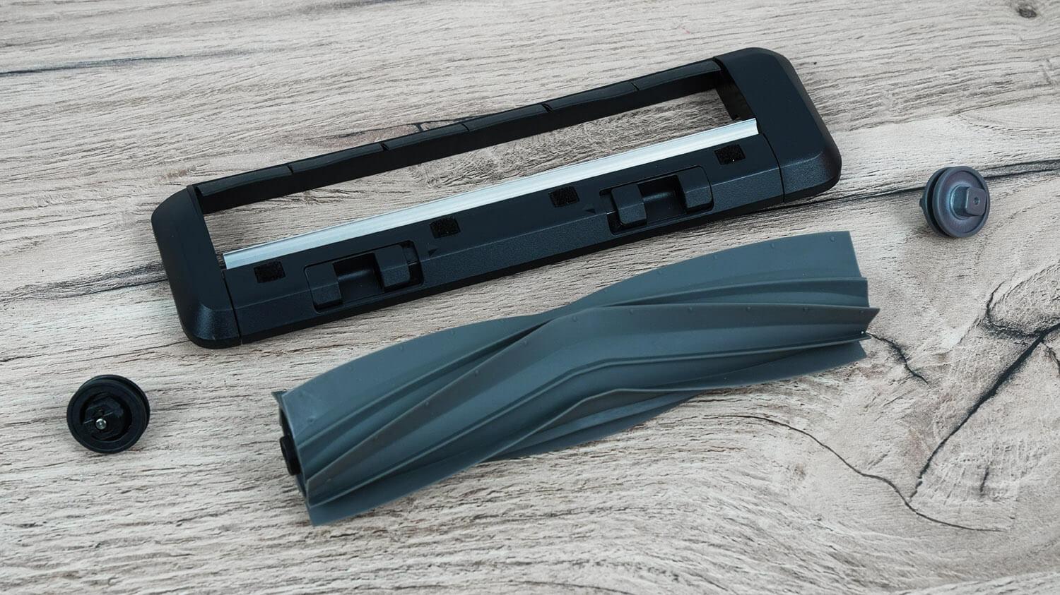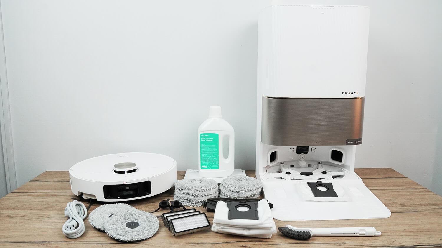 Komplektas yra itin išsamus, kaip iš karto rodo žymėjimas „Pilnas“. Jį sudaro pats robotas, jo stotelė, maitinimo adapteris, du valymo šluosčių laikikliai, instrukcijos, šepetys ir atsarginis valymo maišelis. Taip pat yra papildomas rinkinys, kuriame yra litro butelis ploviklio, 12 valymo šluosčių, du šoniniai šepečiai, silikoninis turbo šepetys, trys HEPA filtrai ir trys stotelės valymo maišeliai.