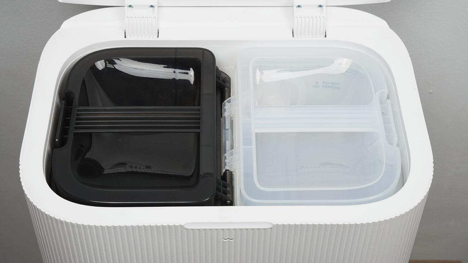 Dulkių talpykla yra po viršutiniu dangčiu. Jo talpa 300 ml. Filtravimo sistema yra tik HEPA. Robotas turi vandens baką, bet jis paslėptas korpuso viduje. Jo talpa 80 ml. Vanduo į baką automatiškai pumpuojamas per stotelę.