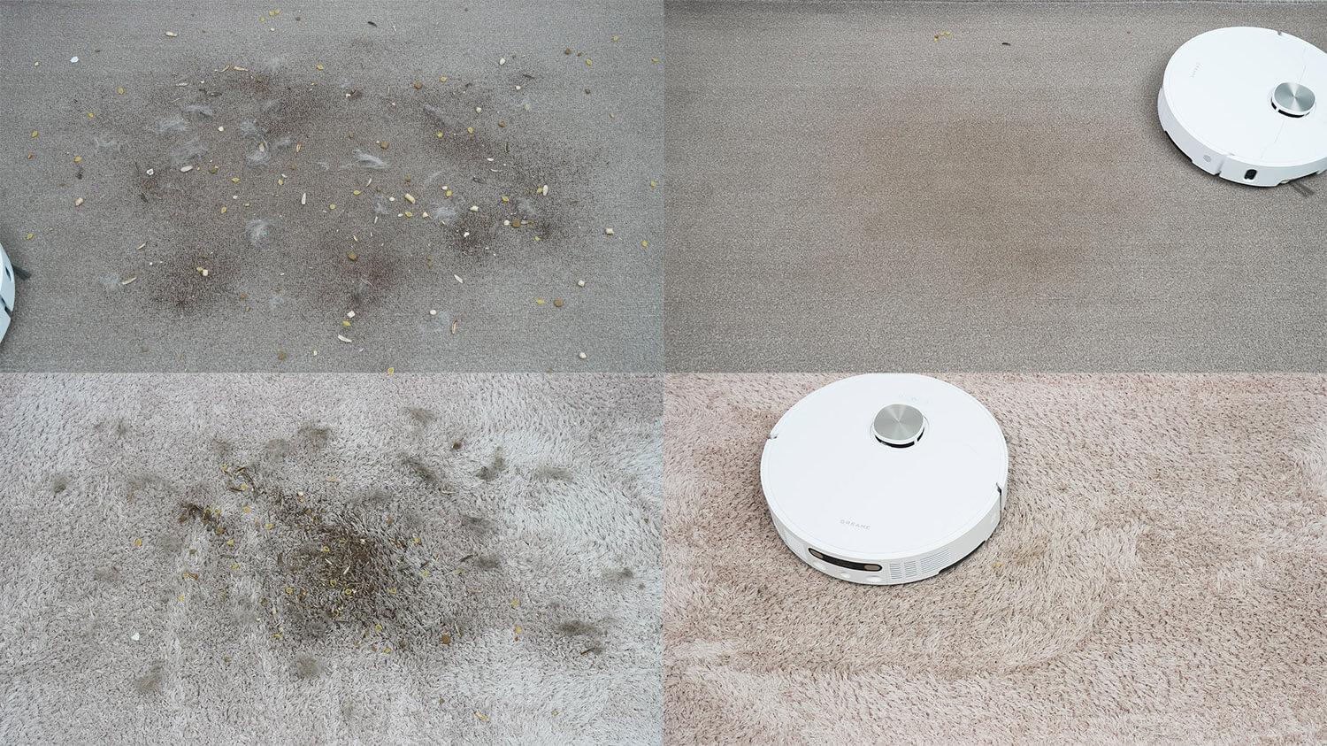 Kalbant apie siurbimo galią, tyliuoju režimu robotas gali siurbti šiukšles iš 2 mm tarpo ir iš dalies iš 4 mm tarpo. Standartiniu režimu robotas patikimiau siurbia iš 4 mm tarpo. Turbo ir maksimalus režimai siūlo panašią siurbimo galią, todėl robotas gali siurbti iš 6 mm ir net 10 mm tarpų. „Maximum+“ yra galingiausias režimas, leidžiantis „Dreame X40 Ultra Complete“ kruopščiau siurbti iš visų tarpų, įskaitant 8 mm. Apskritai šis robotas pasižymi labai didele siurbimo galia ir gali siurbti iš 10 mm tarpo.