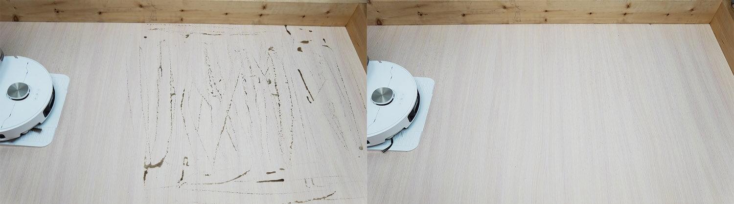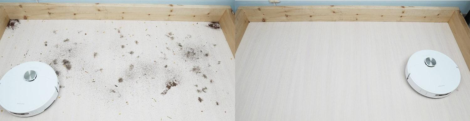 Laminuotų grindų šiukšlių surinkimo kokybė puiki, nepriklausomai nuo konstrukcijos. Robotas dulkių siurblys visiškai išvalė visas grindis, įskaitant kampus. Centrinis ir šoniniai šepečiai švarūs, o visos šiukšlės surenkamos į dulkių konteinerį. Testas sėkmingai išlaikytas!