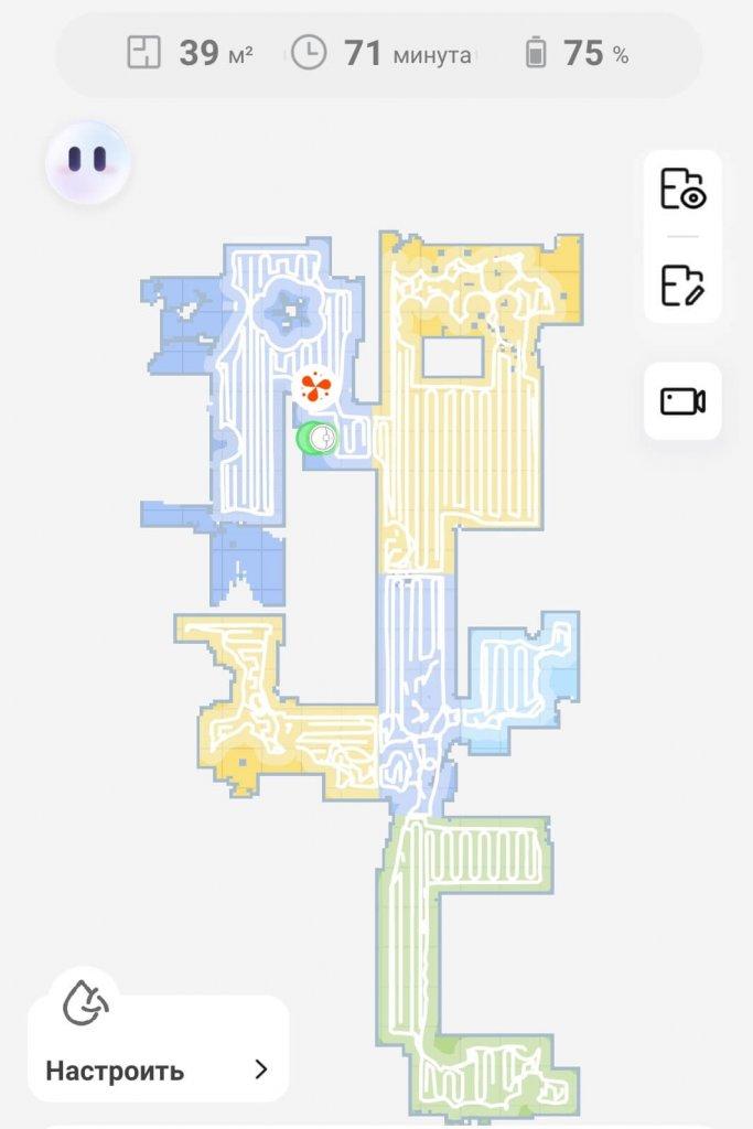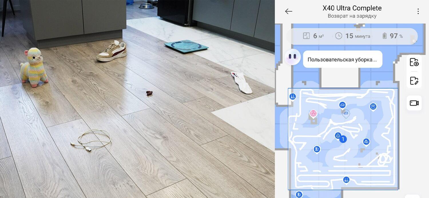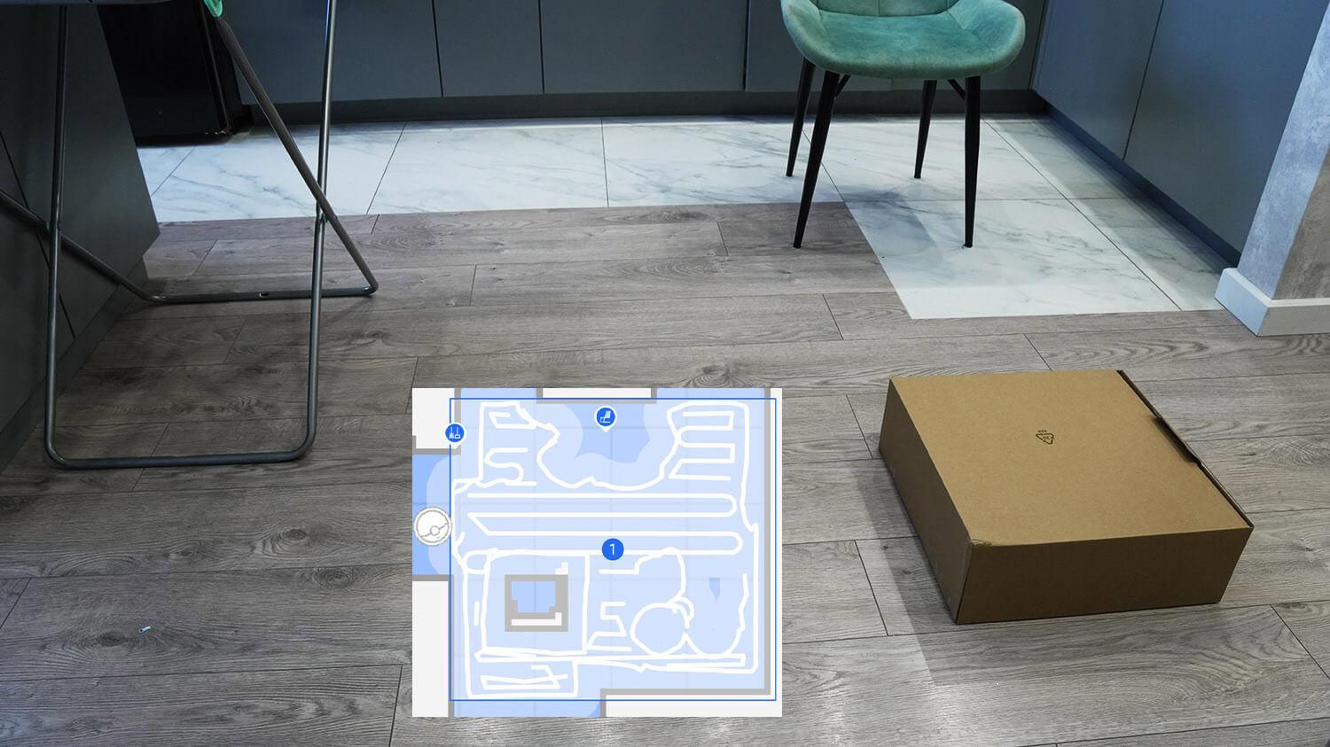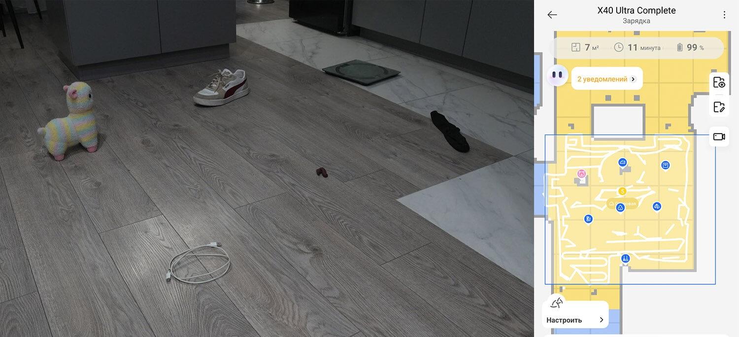 Galiausiai pereikime prie bandymų! Pirmiausia išbandysime „Dreame X40 Ultra Complete“ navigaciją kambaryje su kliūtimis. Robotas dulkių siurblys pirmiausia juda aplink kambario perimetrą, tada išvalo visą galimą plotą gyvatės formos trajektorija. Jis aptiko ir aplenkė džiovyklės kojas. Jis taip pat atskirai apvalė dėžę ir kėdžių kojas, o tada grįžo į stotelę. Bandymas buvo sėkmingas.