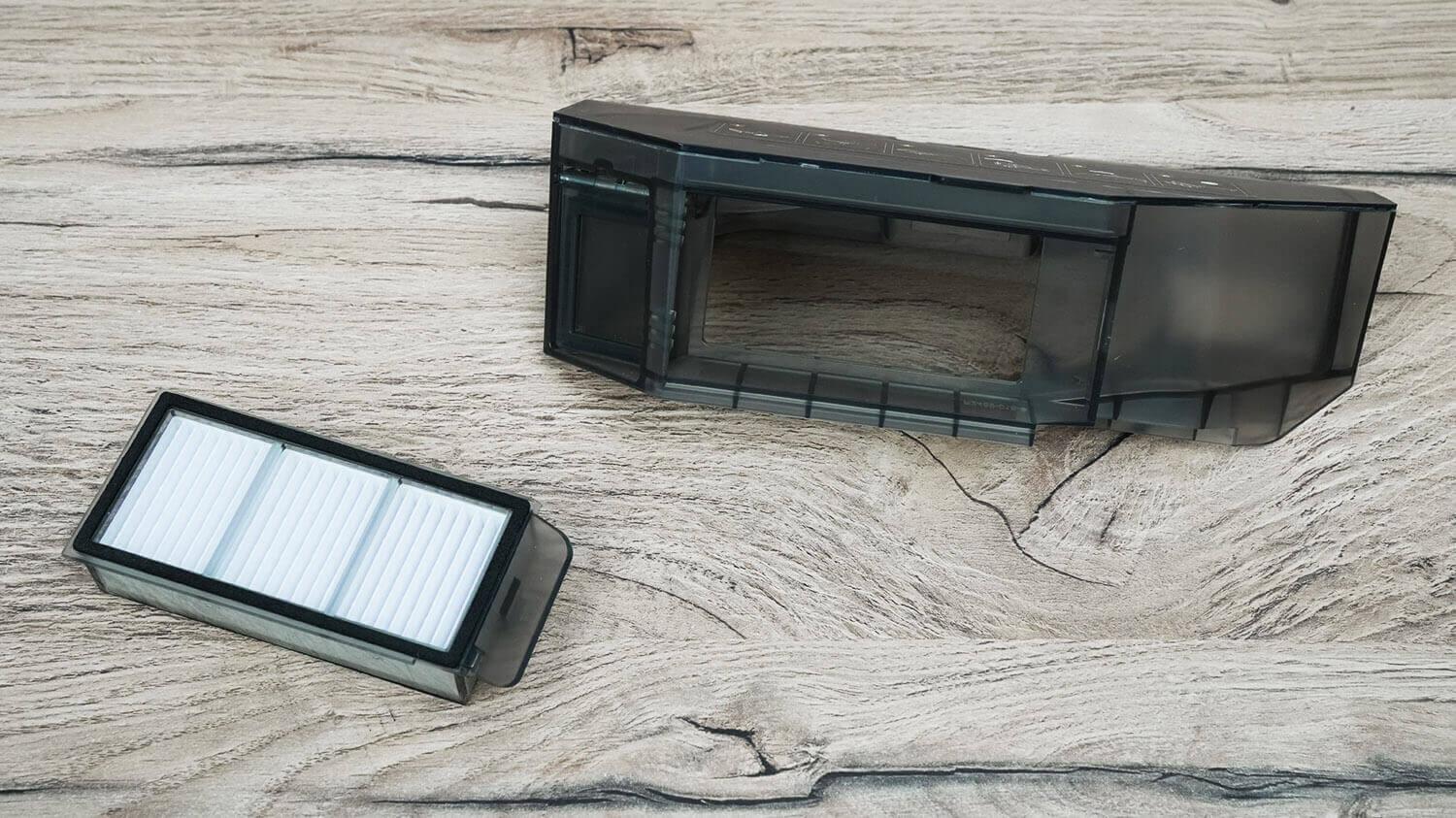 Iškart po „nešvarumų testų“ patikrinau roboto dulkių siurblio savaiminio valymo našumą. Grąžinau jį į stotelę ir paleidau savaiminio valymo ciklą. Rezultatai buvo geri, bet indas nebuvo idealiai švarus. Taip pat matėme, kaip užsikimšęs HEPA filtras. Jam tikrai praverstų tam tikra išankstinio valymo apsauga, pavyzdžiui, tinklelis.