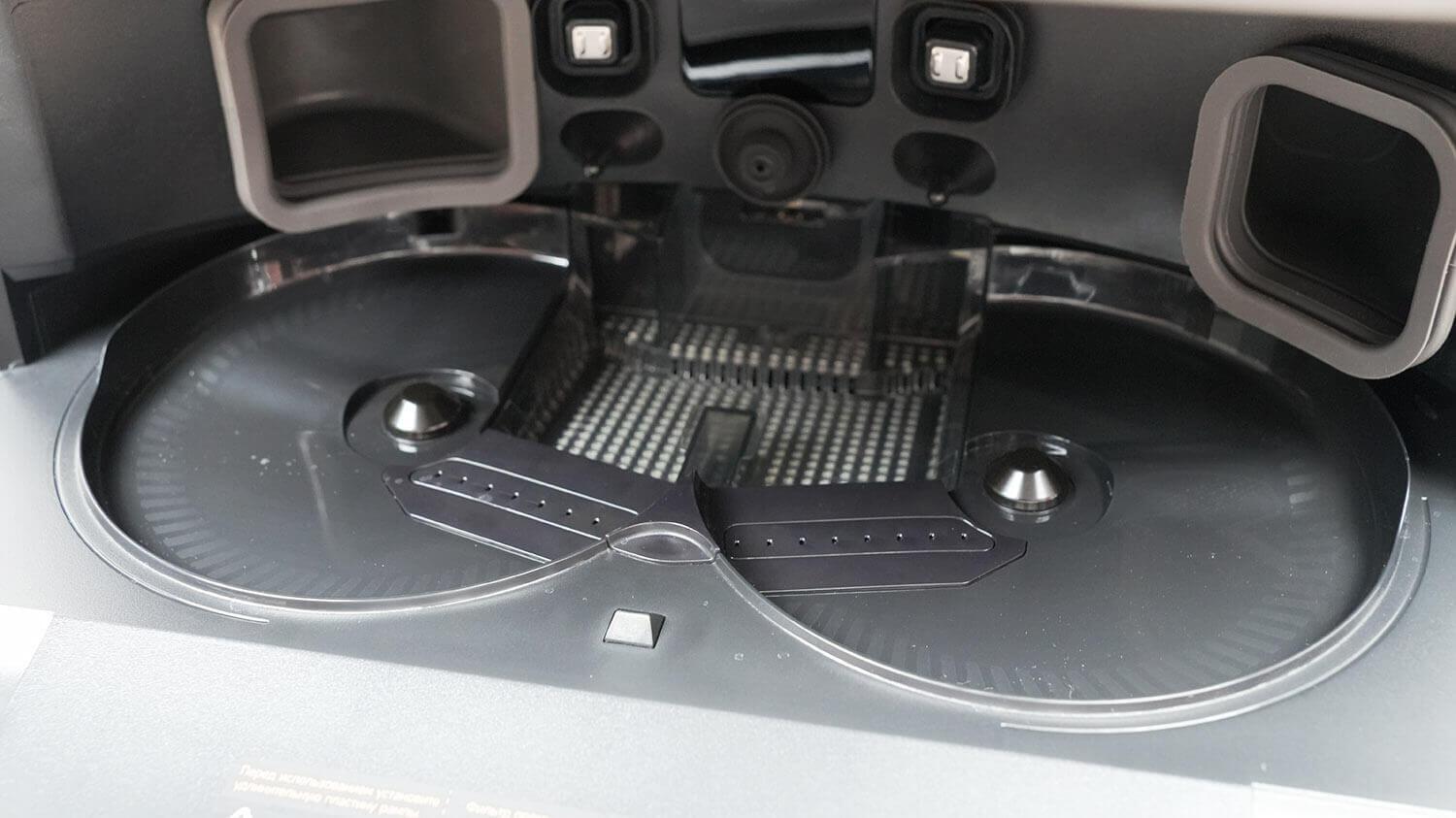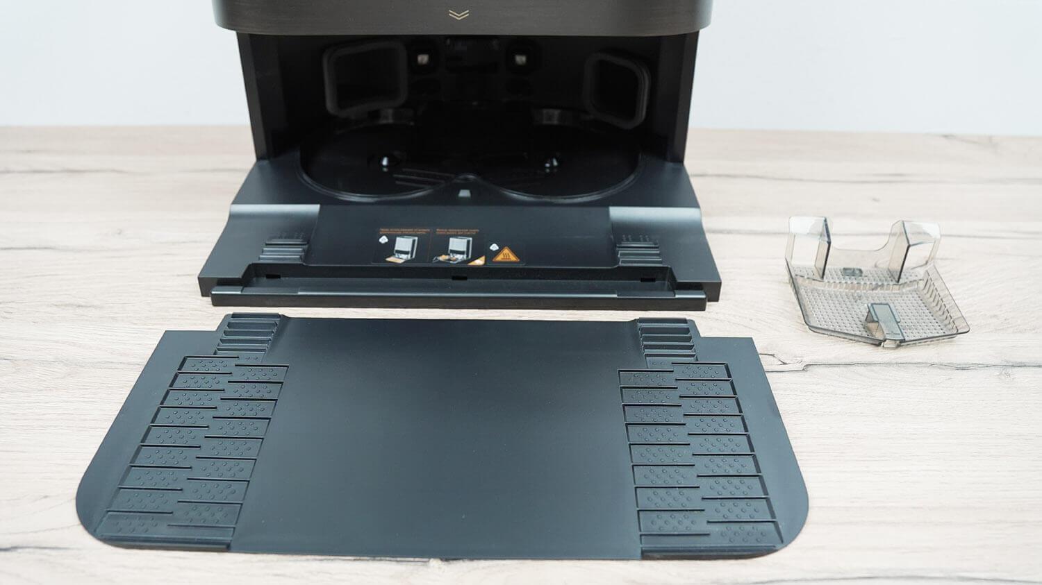 Roboto prieigos rampa yra nuimama, kaip ir šiurkštus filtras dėkle. Tačiau paties dėklo nuimti negalima. Ar tai gerai, ar ne, parodysiu bandymuose. Tarp ventiliacijos angų yra UV lempa servetėlėms džiovinti.