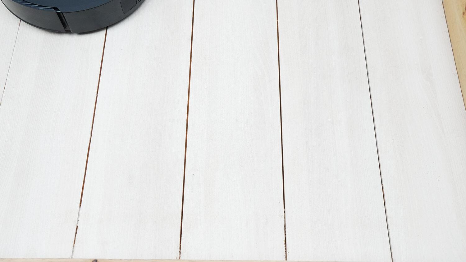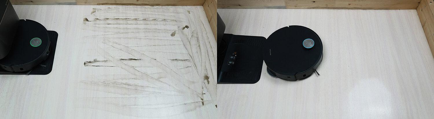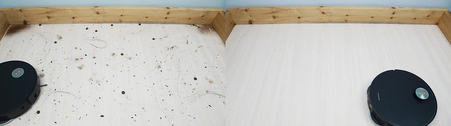 Įvairių rūšių šiukšlių surinkimas nuo laminuotų grindų buvo geras. Iš lentynos buvo surinktos įvairios šiukšlės, įskaitant kačių kraiko granules, kurios dažnai užkemša turbo šepetį. Svarbu tai, kad šis robotas dulkių siurblys gerai išvalė kampus, nepalikdamas jokių šiukšlių. Visa tai dėka ištraukiamo šoninio šepečio.