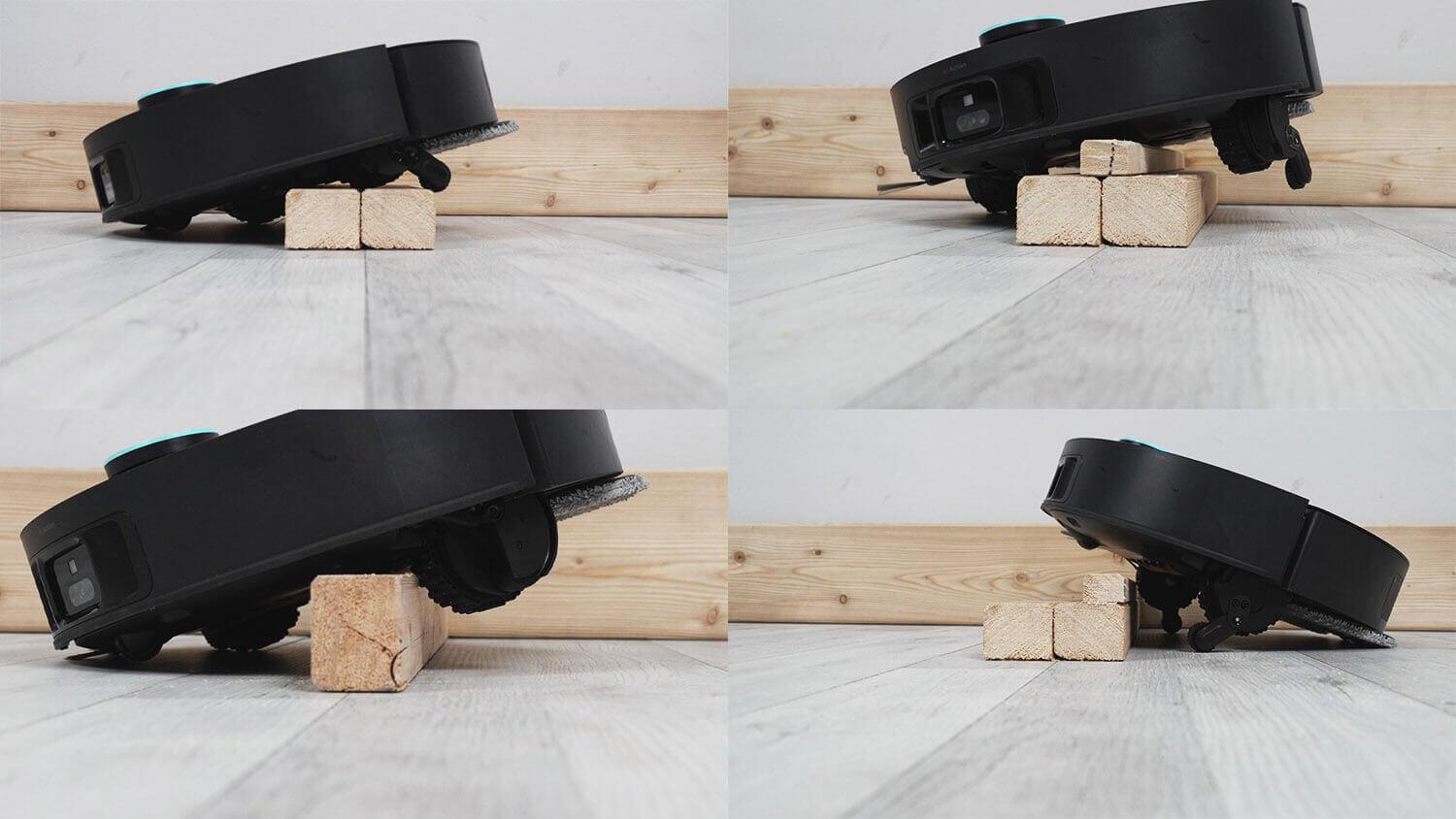 Pradėkime nuo 4 cm slenksčio. Jis jį peržengė be problemų, ir net ir esant tokiems rezultatams, roboto manevringumas yra geriausias rinkoje! Pakėlėme slenkstį iki 5 cm, ir „Dreame X50 Ultra Complete“ sugebėjo jį perlipti! Sąžiningai, to nesitikėjau, turint omenyje, kad reklaminėje medžiagoje nurodytas maksimalus 4,2 cm vieno lygio slenksčio aukštis. Rinkodaros specialistai gali redaguoti informaciją. Ne, ačiū! Tačiau robotas negalėjo perlipti 6 cm slenksčio, kad ir kaip stengtųsi. Aš imitavau gamintojo rekomenduojamą dviejų lygių slenkstį – 4 cm + 2 cm – atnaujinti roboto ratai susidoros su šia užduotimi.