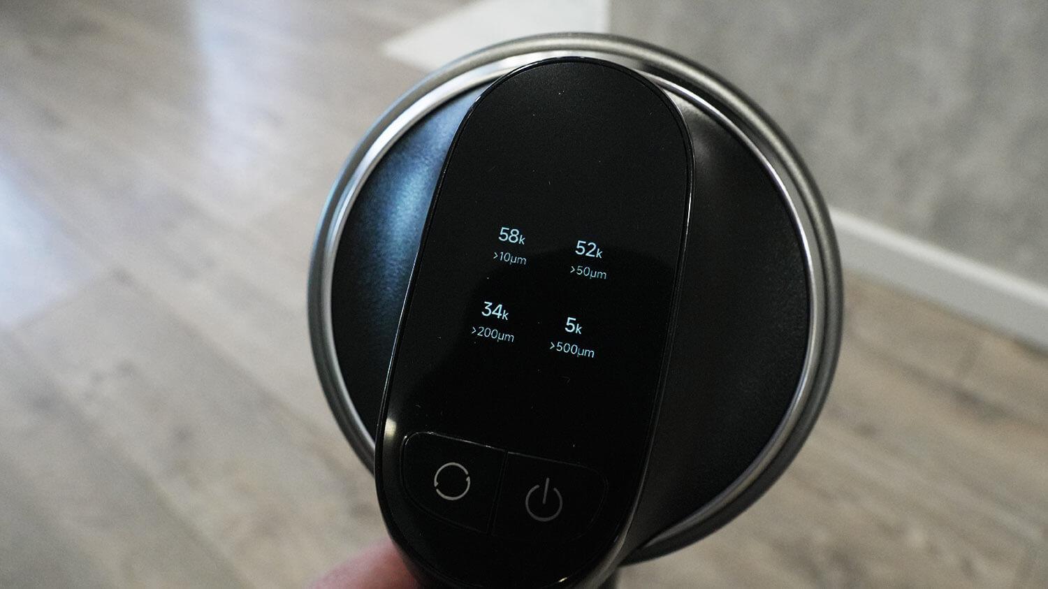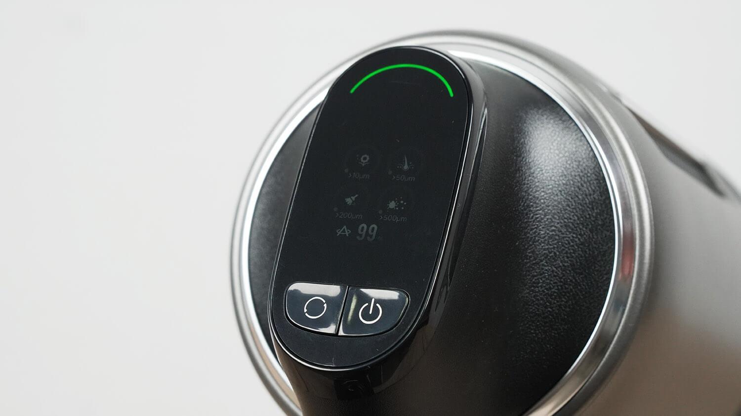 Įrenginio gale yra informatyvus ekranas su valdymo mygtukais: juo įjungiamas ir išjungiamas maitinimas, taip pat perjungiami darbo režimai. Ekrane rodomas akumuliatoriaus įkrovos procentas, pasirinktas darbo režimas ir įvairaus dydžio šiukšlių surinkimo statistika.
