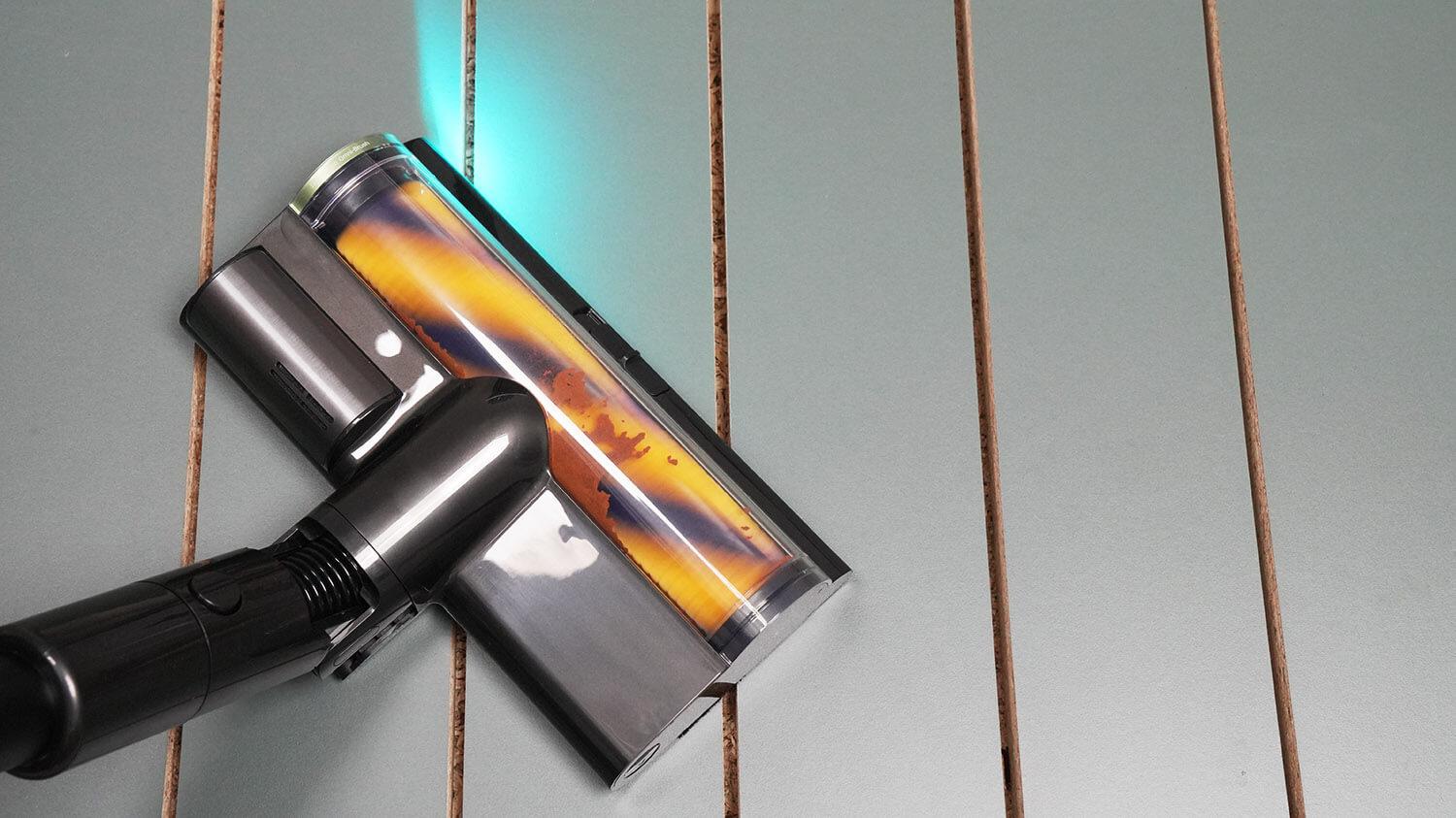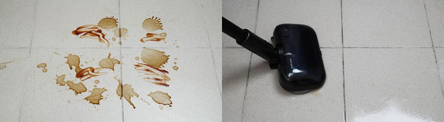 Taip pat išbandžiau grindų blizgiklio veiksmingumą. Jis pašalino net sunkiai įveikiamas dėmes, tokias kaip pridžiūvusios kavos ir padažo dėmės. Pašalinimas užtruko apie dvi minutes, tai yra dar greičiau nei naudojant panašų priedą. Dreame R20 AquaVisa tai dėka naujos vandens purškimo funkcijos, esančios priešais valymo modulį.