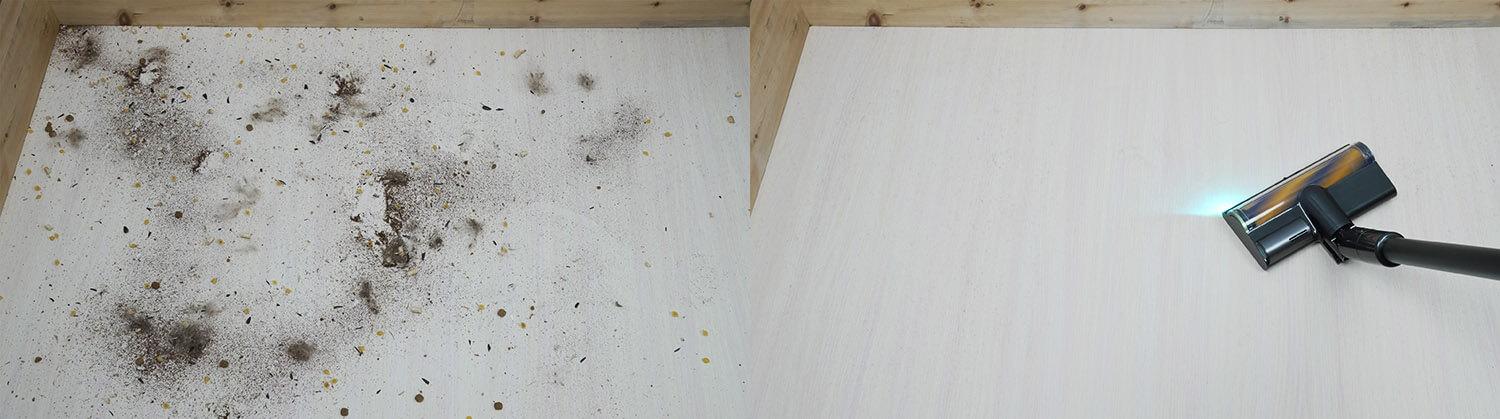 Dabar patikrinkime, kaip gerai „Dreame Z40 Station“ surenka grindų šiukšles su naujuoju antgaliu. Ant laminuotų grindų išbarsčiau įvairių rūšių šiukšles: plaukus, kailį, grūdus ir kitas smulkias buitines šiukšles. Šis prietaisas veikė gerai.