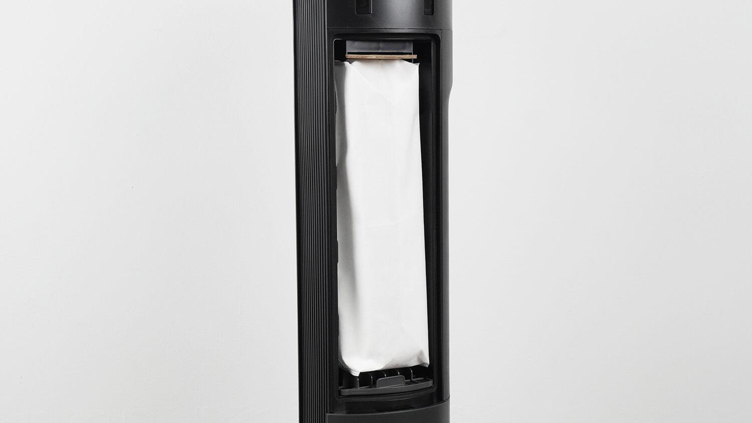 Šone po dangteliu yra 3 litrų talpos šiukšlių maišas. Po juo yra filtras, kurį reikia periodiškai plauti.