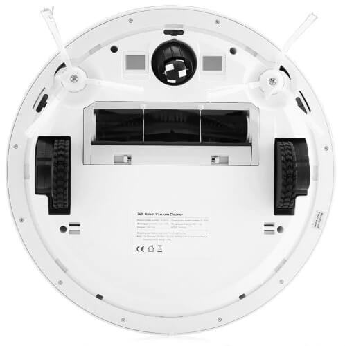 Pažvelgus į roboto dulkių siurblio apačią matyti, kad jame yra du šoniniai ir vienas centrinis šepečiai. Beje, pats centrinis šepetys skiriasi nuo „Xiaomi“ robotuose esančio. „360 S6“ modelyje jis yra šiek tiek mažesnis, o tai turi įtakos valymo našumui (todėl robotas vienu perjungimu surenka mažiau šiukšlių). Priešingu atveju apatinė dalis yra standartinė, joje yra varomieji ratai ir pasukamas volelis, taip pat kontaktiniai padėklai pagrindo įkrovimui.