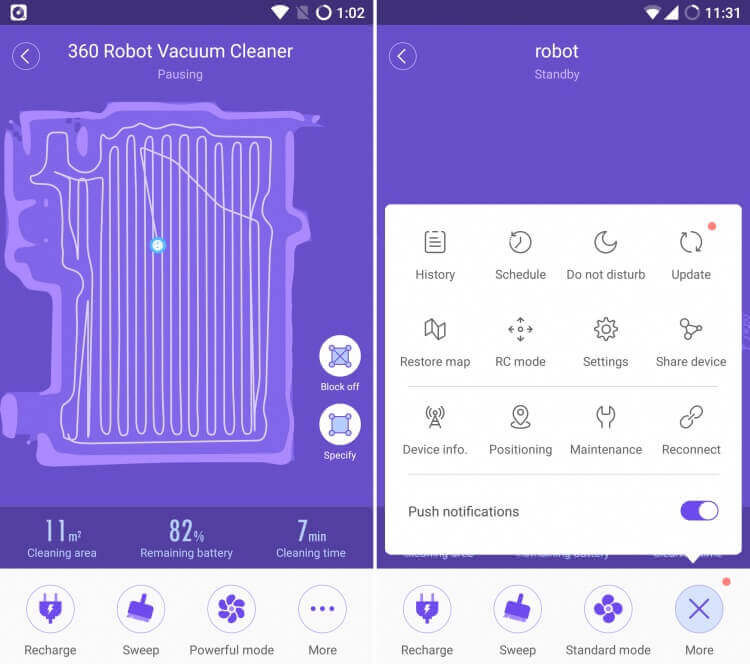 - Roboto dulkių siurblio valdymo programėlė yra gana išmani ir funkcionali. Ji leidžia ne tik paleisti robotą automatiniu arba rankiniu režimu, bet ir apriboti valymo zonas, pasirinkti zoną intensyvesniam valymui ir grąžinti jį į įkrovimo stotelę. Taip pat galite peržiūrėti valymo istoriją, nustatyti tvarkaraštį (savaitinis programavimas) ir sužinoti, kurias eksploatacines medžiagas reikia pakeisti (aptarnavimas).