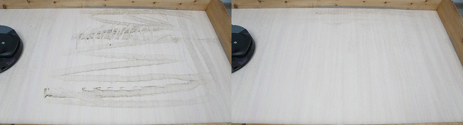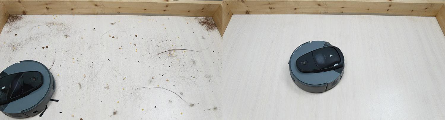 Robotas gali išvalyti nedideles dėmes nuo grindų, sugerdamas nešvarumus nepalikdamas dryžių. Tačiau akloji zona vis dar gana didelė, apie 7 cm. Taip greičiausiai yra todėl, kad šluostė nespaudžia taip stipriai prie kraštų ir negali efektyviai pašalinti dėmių.