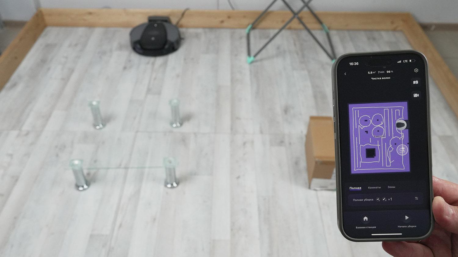 Galiausiai pereikime prie bandymų. Pirmiausia išbandysime „3i G10+“ navigaciją kambaryje su kliūtimis. Pirmiausia robotas apeina kambario perimetrą, o tada išvalo visą prieinamą plotą vingiuotu raštu. Jis neužklimpo ant džiovyklės kojų, o perbėgo jas. Jis taip pat apšlavė dėžę ir stalo kojas. Apskritai robotas bandyme pasirodė taip pat gerai, kaip ir jo kolegos, be jokių didesnių problemų.