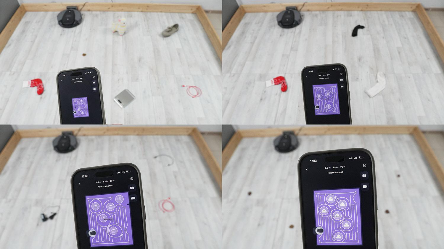 Įvairių rūšių šiukšlių surinkimas nuo laminuotų grindų buvo geras. Iš lentynos buvo surinktos įvairios šiukšlės, įskaitant kačių kraiko granules, kurios dažnai užkemša turbo šepetį. Net kampai buvo visiškai išvalyti dėl ištraukiamo šoninio šepečio, o tai yra privalumas. Robotas taip pat gerai išvalė tiek vidinius, tiek išorinius kampus. Turbo šepetys surinko šiek tiek kailio ir plaukų, bet šoninis šepetys buvo švarus. Apsaugos nuo plaukų vyniojimo sistemą išbandysiu vėliau atskirai.