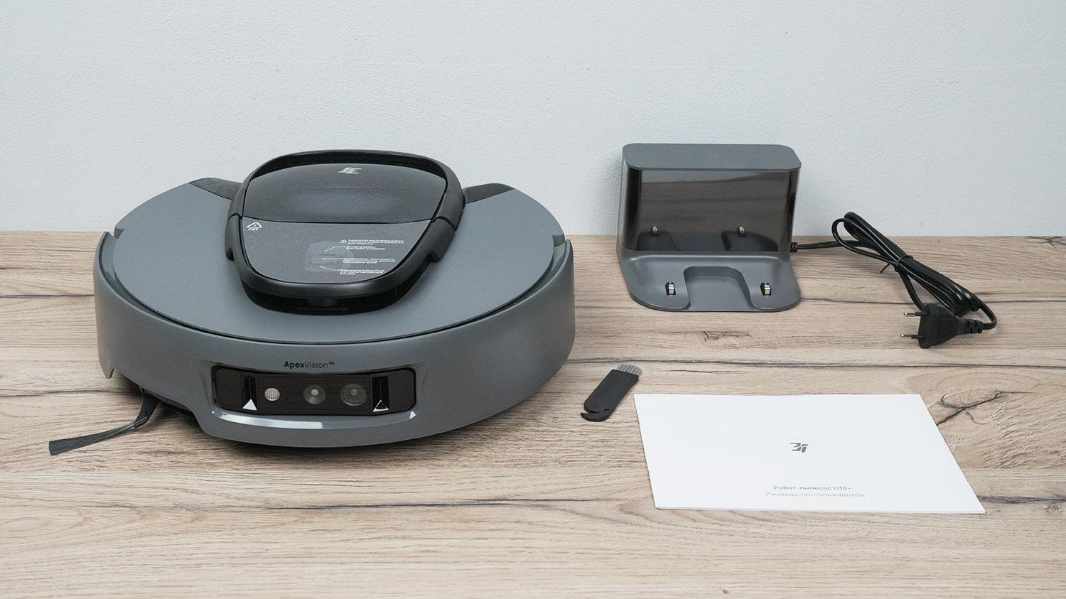 Į komplektą įeina pats robotas dulkių siurblys, įkrovimo stotelė, valymo įrankis ir naudojimo instrukcija rusų kalba.
