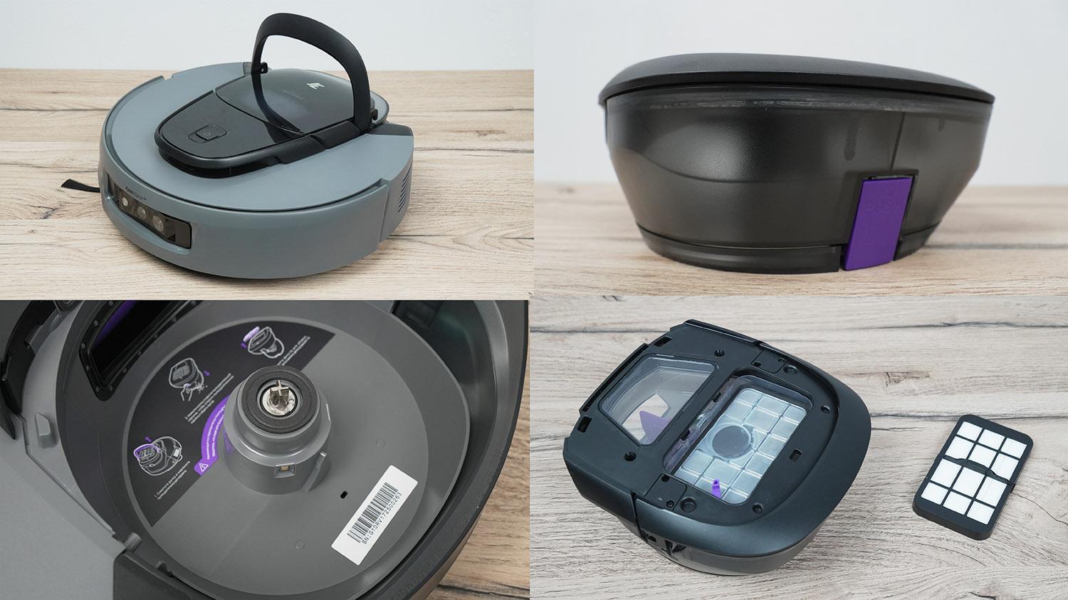 Korpuso viršuje sumontuoti trys mechaninio valdymo mygtukai. Lidaras yra apačioje. Dulkių konteineris sumontuotas viršuje ir turi patogią nešiojimo rankeną. Korpuse yra presavimo mechanizmas lengvoms šiukšlėms. Konteineris ištuštinamas paspaudus mygtuką. Viduje matomas presavimo peilis. Beje, dulkių konteinerio talpa yra 1 litras, todėl jo nereikės dažnai tuštinti. Filtravimo sistemoje naudojamas HEPA filtras ir tinklelio sietelis. Be to, konteineryje yra ultravioletinė lempa surinktoms šiukšlėms dezinfekuoti.