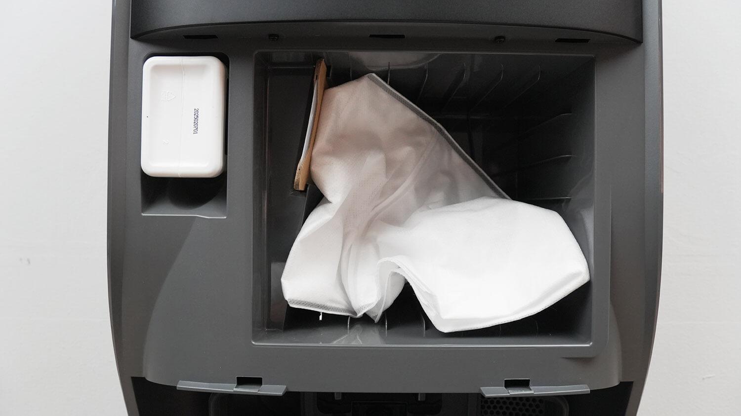 Stotelės centre, po dangčiu, yra standartinis atliekų surinkimo maišas ir skyrius ploviklio kasetei. Šios kasetės talpa yra 280 ml, ji yra vienkartinė.