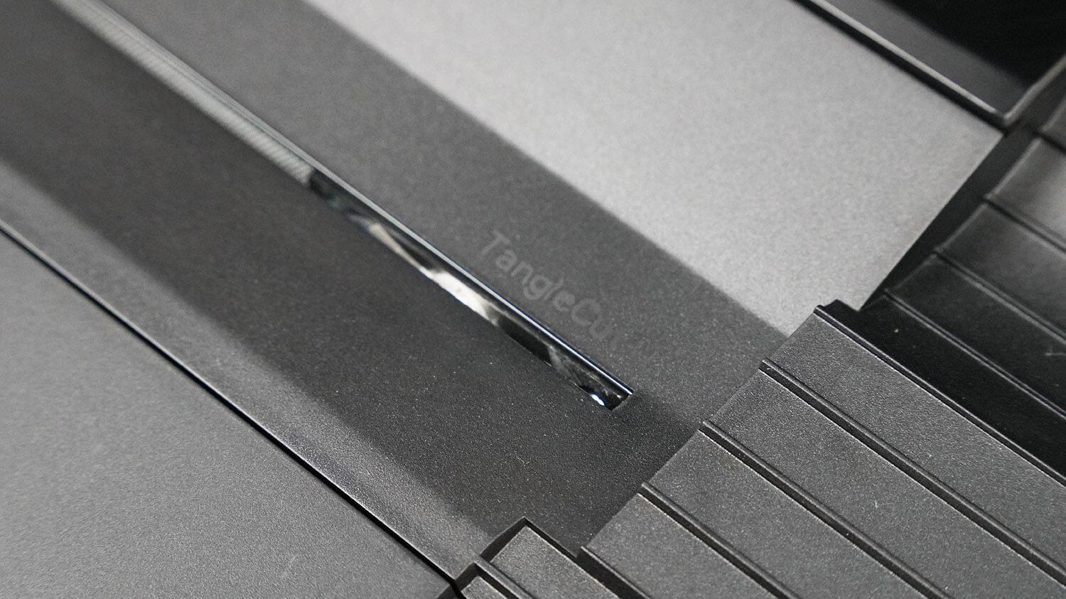 Roboto rampa yra nuimama. Už jos yra padėklas nukirptų plaukų likučiams surinkti.