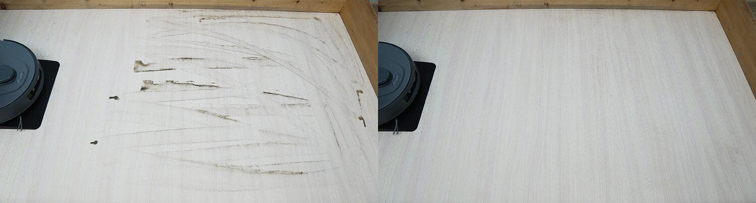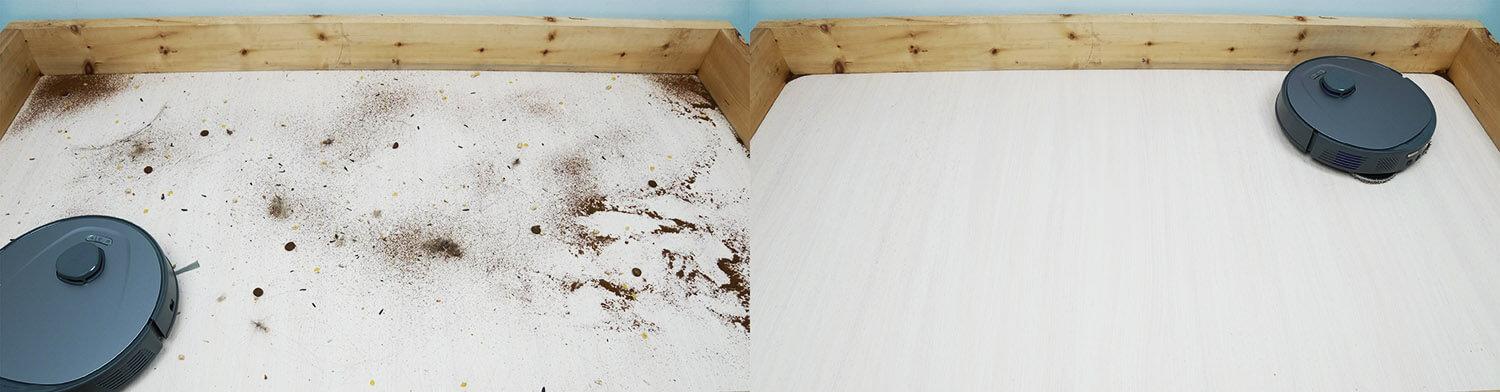 Įvairių rūšių šiukšlių surinkimo našumas nuo laminuotų grindų yra geras. Iš lentynos buvo surinktos įvairios šiukšlės, įskaitant kačių kraiko granules, kurios dažnai užkemša turbo šepetį. Neiššluoti lieka tik kampai, o tai yra daugelio apvalių robotų problema. Turbo šepetys surinko kailį ir plaukus, bet šoninis šepetys buvo švarus. Toliau atskirai išbandysiu apsaugos nuo plaukų vyniojimo sistemą.