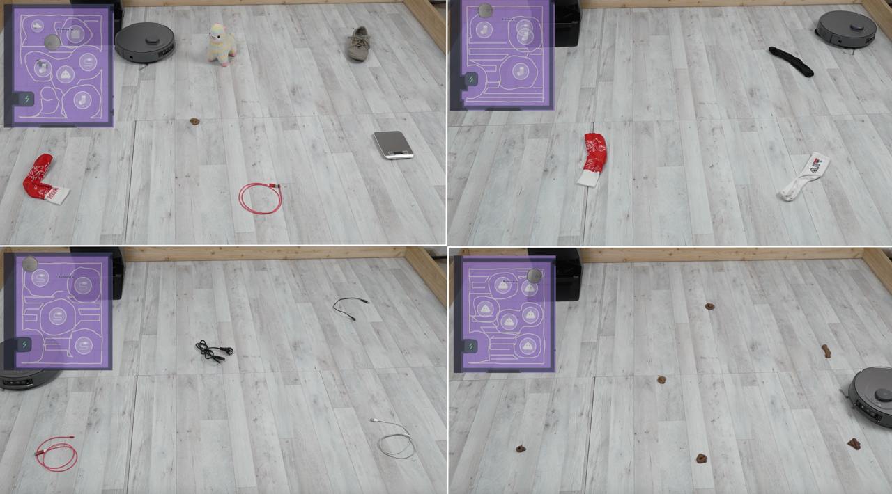 Kalbant apie objektų vengimo sistemą, buvau maloniai nustebintas! Esant geram apšvietimui, robotas sugebėjo tiksliai išvengti 6 iš 6 objektų ant grindų, teisingai atpažindamas 5 iš jų, išskyrus žaislą. Jis taip pat sugebėjo teisingai atpažinti ir tiksliai išvengti 3 iš 3 kojinių ir visų 4 iš 4 laidų. Kalbant apie naminių gyvūnėlių staigmenų imitacijų vengimą, robotas dulkių siurblys teisingai atpažino visus 6 spąstus, bet vieną iš jų pagavo šepečiu ir šluoste, todėl jam skirsime 5 balus iš 6.